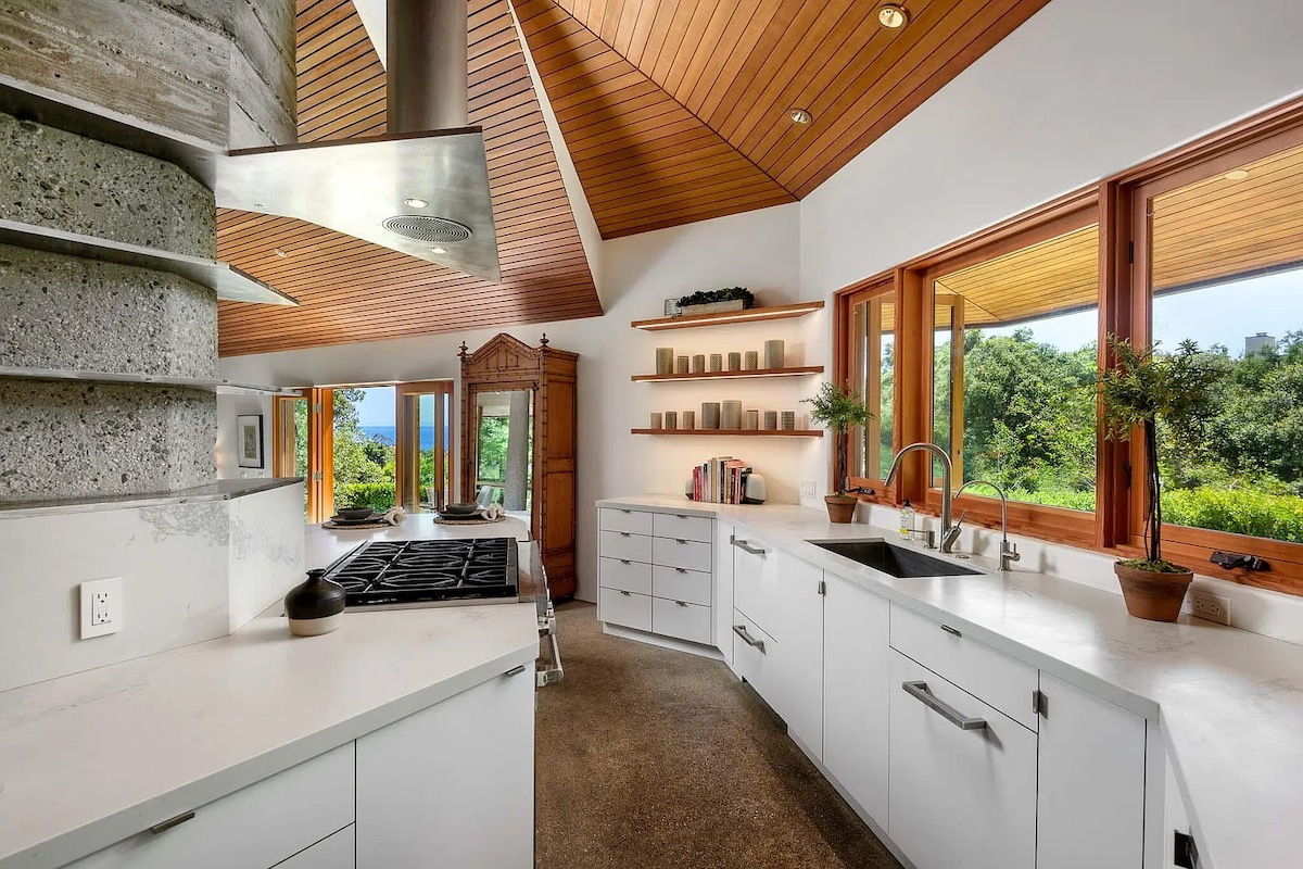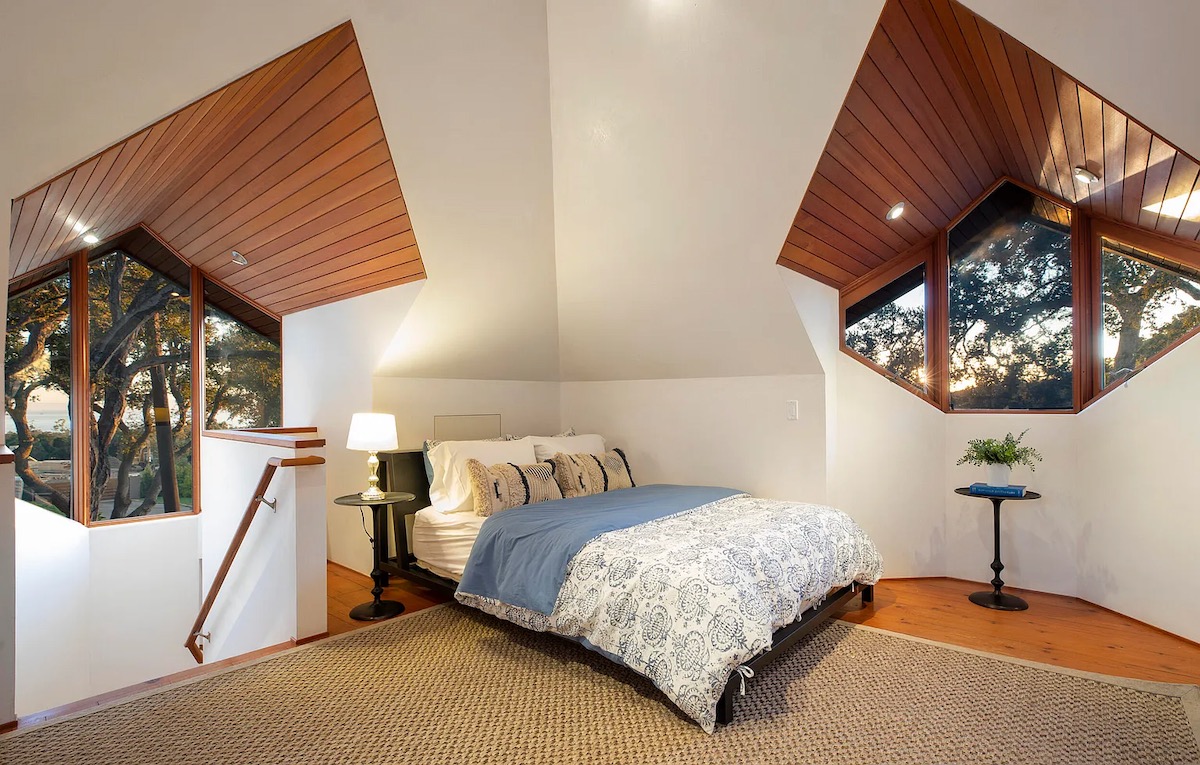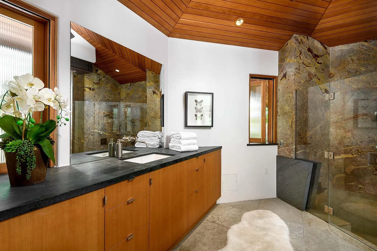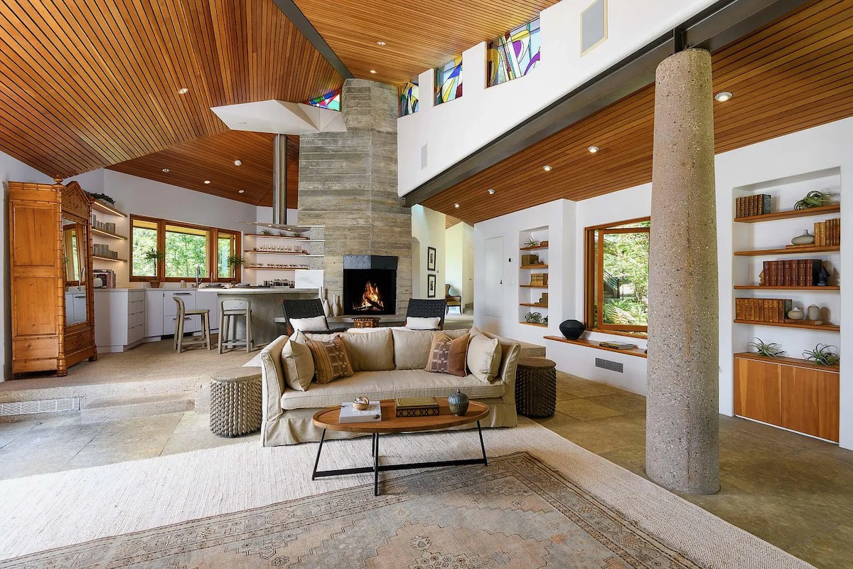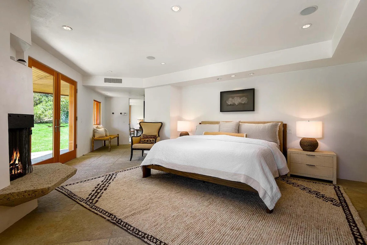 If you’ve ever been on the San Ysidro Trail, you’ve undoubtedly noticed the striking facade and roofline of 1800 E. Mountain Drive ($6.45 million), just above the trailhead. The interiors are as wild as you’d hope, with untraditional angles everywhere. While it might agitate a feng shui expert, it’s also pretty cool. The floor plan is for someone who likes to keep guests at a distance: the two guest rooms in the main house are only accessible from outside, and there’s another small room above the freestanding garage. The location can’t be beat for hiking—or for dinner at the San Ysidro Ranch across the way.