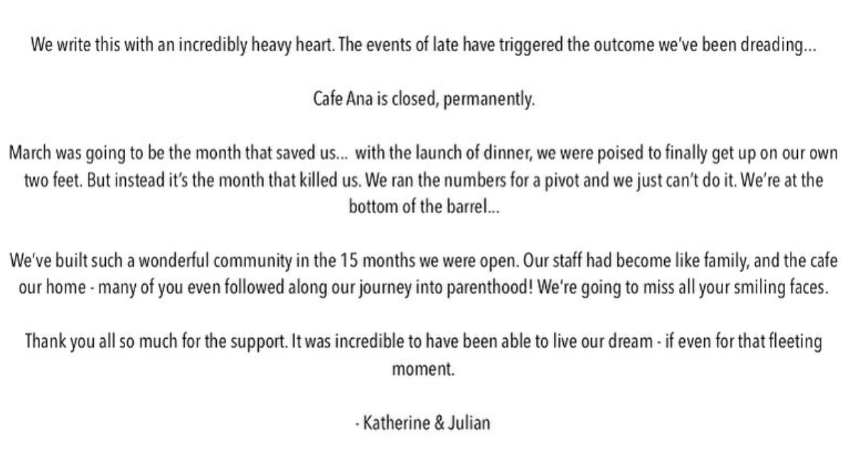 I’m sorry to have to report that Café Ana won’t be reopening. The statement from Julian Sanders and Katherine Guzman Sanders is below. The restaurant opened at the corner of Anacapa and Anapamu—hence the name—in late 2018. They’re planning a sale “when the dust settles.”