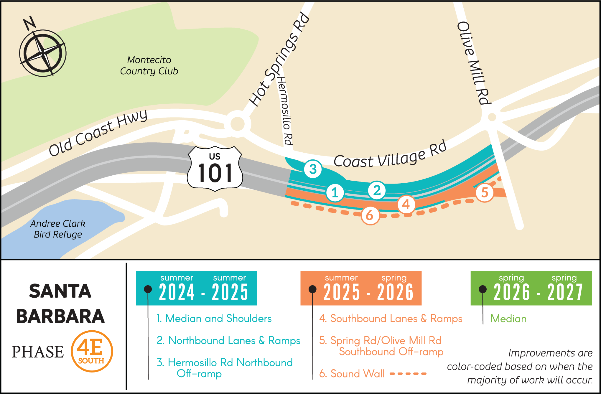 ••• From the latest Highway 101 construction update: “Freeway improvements will continue in Montecito and move into the Santa Barbara South segment in late summer. In the Santa Barbara South segment, new freeway lanes and on- and off-ramps will be built between Olive Mill and Hermosillo Roads. […] Crews will work on the northbound side starting this summer with divided lanes. To provide space for construction, the northbound lanes will be divided by safety barriers between Hixon and Olive Mill Roads from summer 2024 to summer 2025. One northbound lane will be located on the southbound side. The northbound off-ramps will close consecutively, so drivers can use the off-ramp before or after a closure. Lanes will be the standard 12-feet wide throughout the divided lane area. A similar approach will be used to construct the southbound lanes in 2025.”