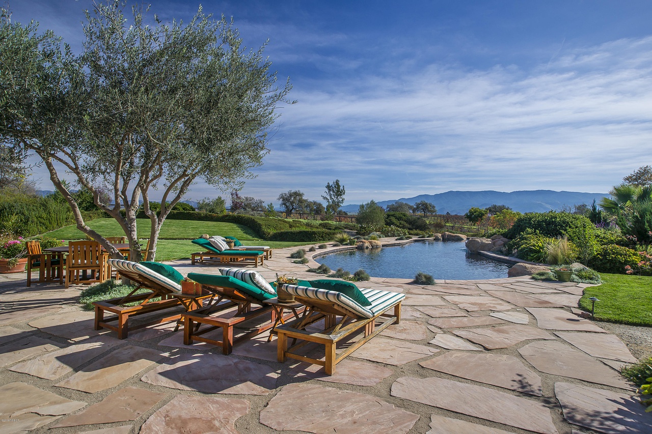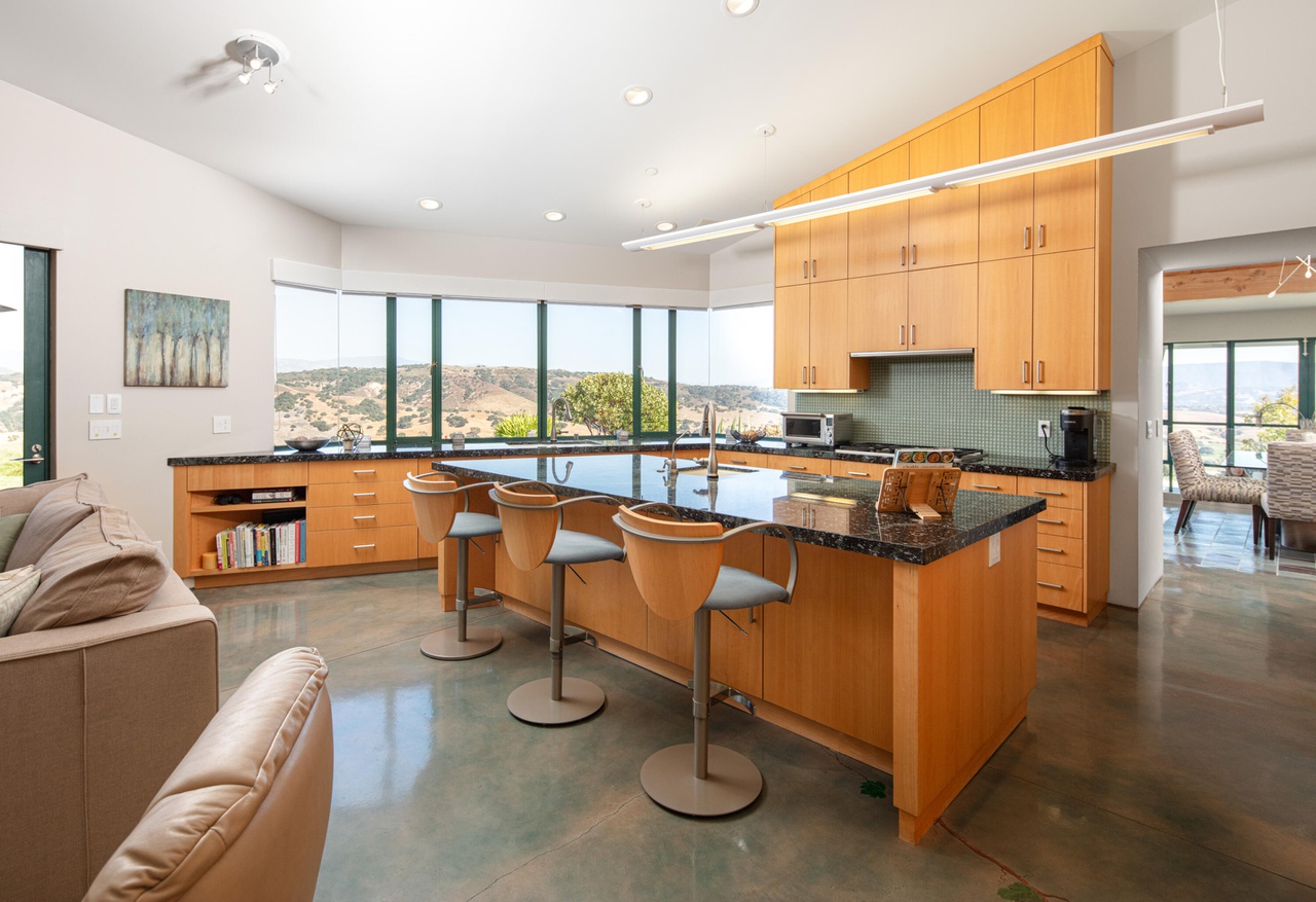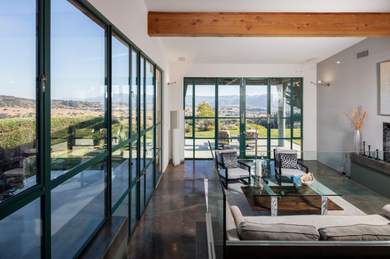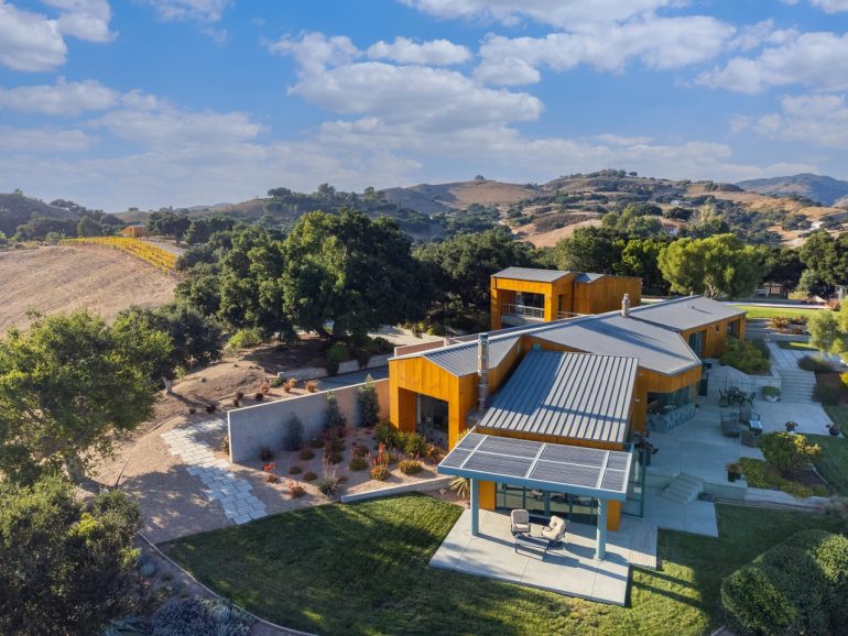Something completely different is on hand at 1270 Poppy Valley Road ($4.25 million), on 20 acres in the Jonata Springs gated community north of Buellton. Built in 2006, the three-bedroom house is very 1990s—to wit, the unexpected angles, glass partitions, industrial materials, and so on—and you’d expect a guest house with all that land. But wow, what a view from the living room and terrace!