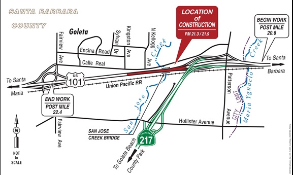 ••• “Highway 101 between Patterson and Fairview Avenue as it runs through Goleta sits atop the San Jose Creek Bridge, which is built of a concrete aggregate that has been found to be susceptible to expansion and contraction. Caltrans is mapping out a project to replace the bridge that will cost about $20 million and take 280 days to complete over two construction seasons. […] One lane will close in both directions as the work progresses, but two would remain open. Concrete barriers will line the worksite, and highway traffic speeds will go down from 65mph to 55mph.” Best case, the construction will run from June 2022 to December 2024.—Independent