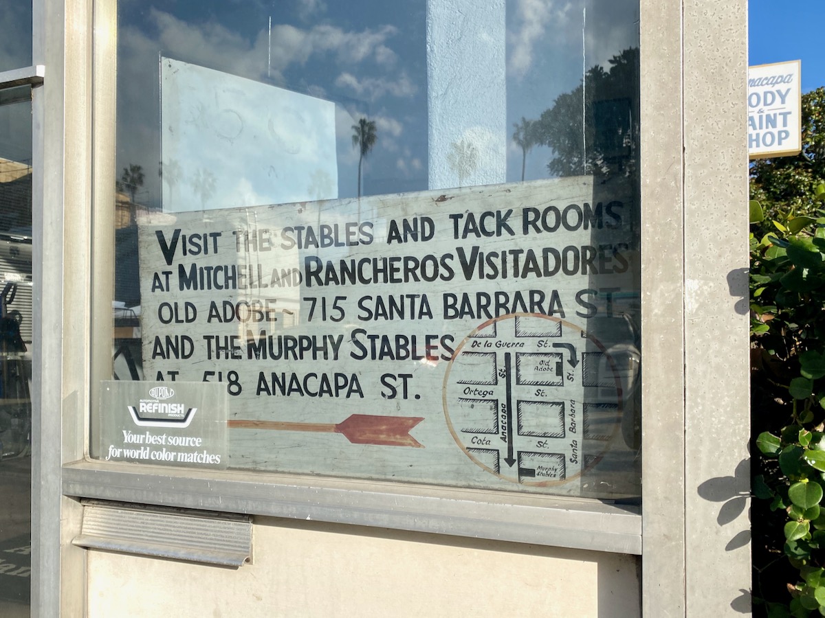 ••• This sign in the window of Anacapa Body Shop got me curious, so I called, and they said that it dates from many decades ago, when stables were at that site. You can read more about Rancheros Vistadores—”a men’s club centered around horseback riding [to] salute the ranching lifestyle”—here.