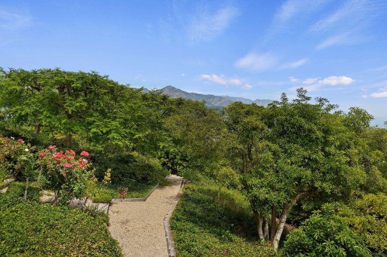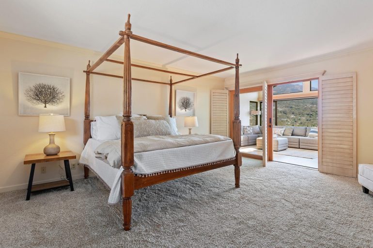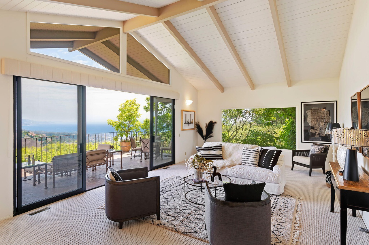 1048 Las Alturas Road ($3.995 million) looks single-story from the front, but it drops down the side of the hill, with a lower-level suite that could be standalone. While the interiors need a redo—the primary bedroom has glass doors to the family room—the views are sublime.