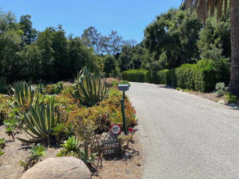 Nearby is 3155 Eucalyptus Hill Road, currently on the market for $2.695 million. The house isn’t visible from the street, but I’d still be tempted to put up a fence and gate, because the usable outdoor space is on the road side of the house.