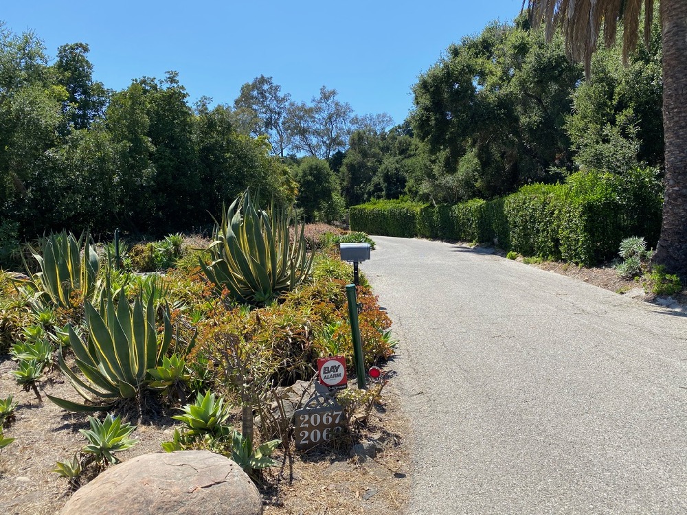 Google Maps says that the next street branching off to the west is also called Eucalyptus Hill Road, but there’s no street sign, and an emphatic “private/no trespassing” sign warned me off. Looking at a map later, I saw that 2067 and 2069 Eucalyptus Hill Road are huge lots.