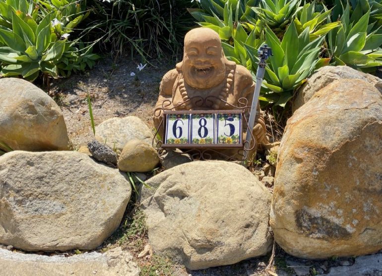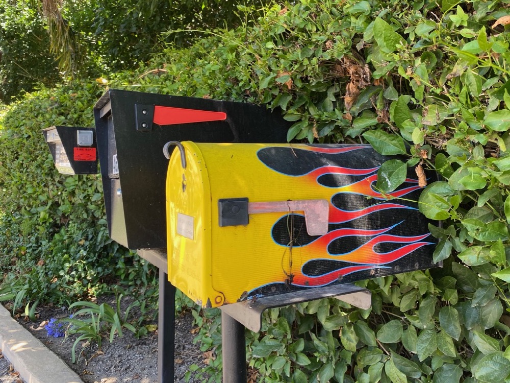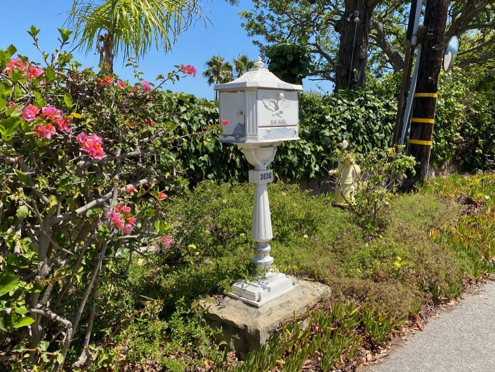 Back to Eucalyptus Hill Road…. I always find it amusing when a homeowner installs gatepost ornaments far grander than the house warrants. And there was another ye olde mailbox—could they be vestigial from when the area was first subdivided?