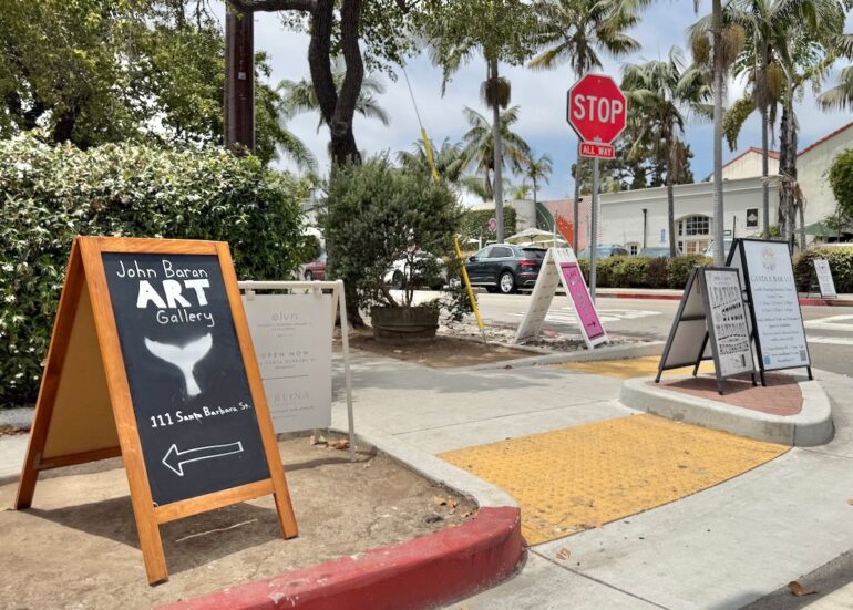 ••• “Temporary signs in the public right-of-way that promote businesses cannot be taller than 42 inches, must be free-standing, and must be off the sidewalk, according to an ordinance approved by the Santa Barbara City Council. […] All temporary signs are banned in the city’s El Pueblo Viejo Historic District.” Does anyone think this looks good? —Noozhawk
