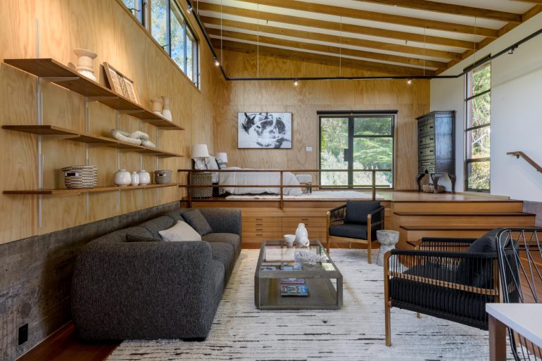 The main residence tiers naturally with the gradual slope of the site. The layout orients around the back courtyard, with each living space opening out to the saltwater pool and spa, outdoor dining area, fire pit lounge, and flat lawn overlooking the orchard with sweeping ocean views.