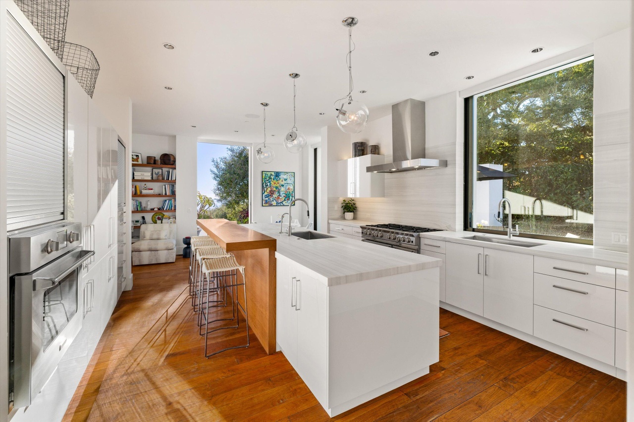 Properties at the top of Pepper Hill rarely come on the market, which is enough to make 356 Woodley Road ($34.5 million) notable—it has an enviable combination of convenience and views, in a location where you might still be able to get insurance (or at least that was the case before this week’s horrific fires in L.A.). To that, add size: the house is 7,518 square feet, mostly one-level, on 2.53 acres (which includes a separate parcel on Glenview Road). This style of architecture puts a lot of emphasis on materials; the wood here and there—floors in some parts of the house, and paneling in others—would be welcome elsewhere. P.S. Given the eastward positioning, this is a house for us morning people.