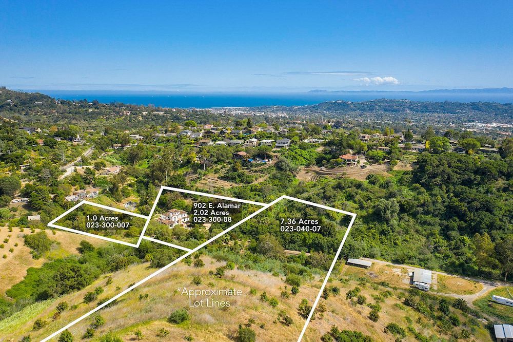 The 10-acre property at 902 E. Alamar Avenue (↓$300K to $2.95M), above San Roque, is in three parcels (1, 2, and 7.3 acres); the middle one has a five-bedroom, three-bath house from 1989 on it.