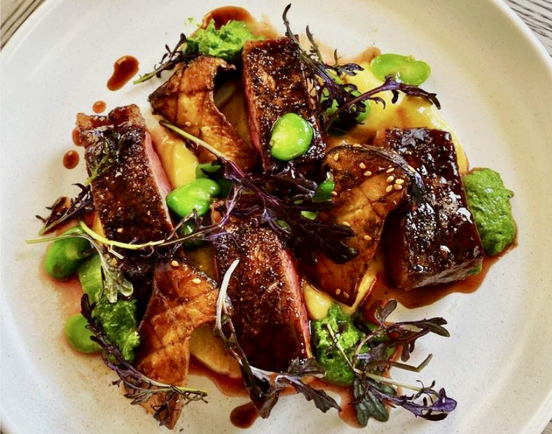 ••• Costa, the fancier of the two restaurants at the Mar Monte Hotel on East Beach, says it’s opening for real in June. Right: dry-aged Santa Carota strip steak with frill mustard, pickled garlic scape, fava beans, and king trumpet mushroom. (Speaking of East Beach, what a shame that La Sirena at Cabrillo Pavilion appears indefinitely stalled.)
