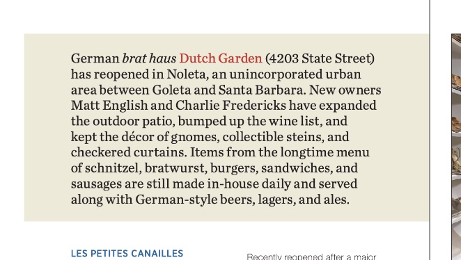 ••• 805 Living reported that the Dutch Garden has finally reopened, but I think that’s premature, as it still looked closed when I stopped by the other day. I think we might logically assume, however, that someone at the restaurant told the magazine that the opening is imminent. If anyone out there has a way of communicating with the owners or management, please let them know I’d love to be kept in the loop—so I can keep you in the loop. UPDATE: An inside source told a reader that the restaurant is shooting for October 18.
