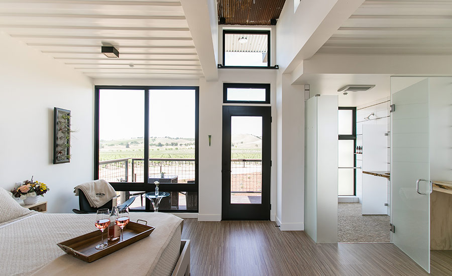 ••• “Steve Cass of Cass Winery in Paso Robles wanted ‘a really killer, unique’ design for a bed and breakfast lodging [….] At the end of May, he and partner Ted Plemons celebrated the opening of the Geneseo Inn, a truly original take on wine country lodging. The eight units nestled at the edge of the 150-acre estate vineyard are made of recycled steel shipping containers, propped eight feet up in the air to offer views of the bucolic scenery. The 400-square-foot units are compact, but roomier than you might expect thanks to the way the containers are configured.” —Pacific Coast Business Times
