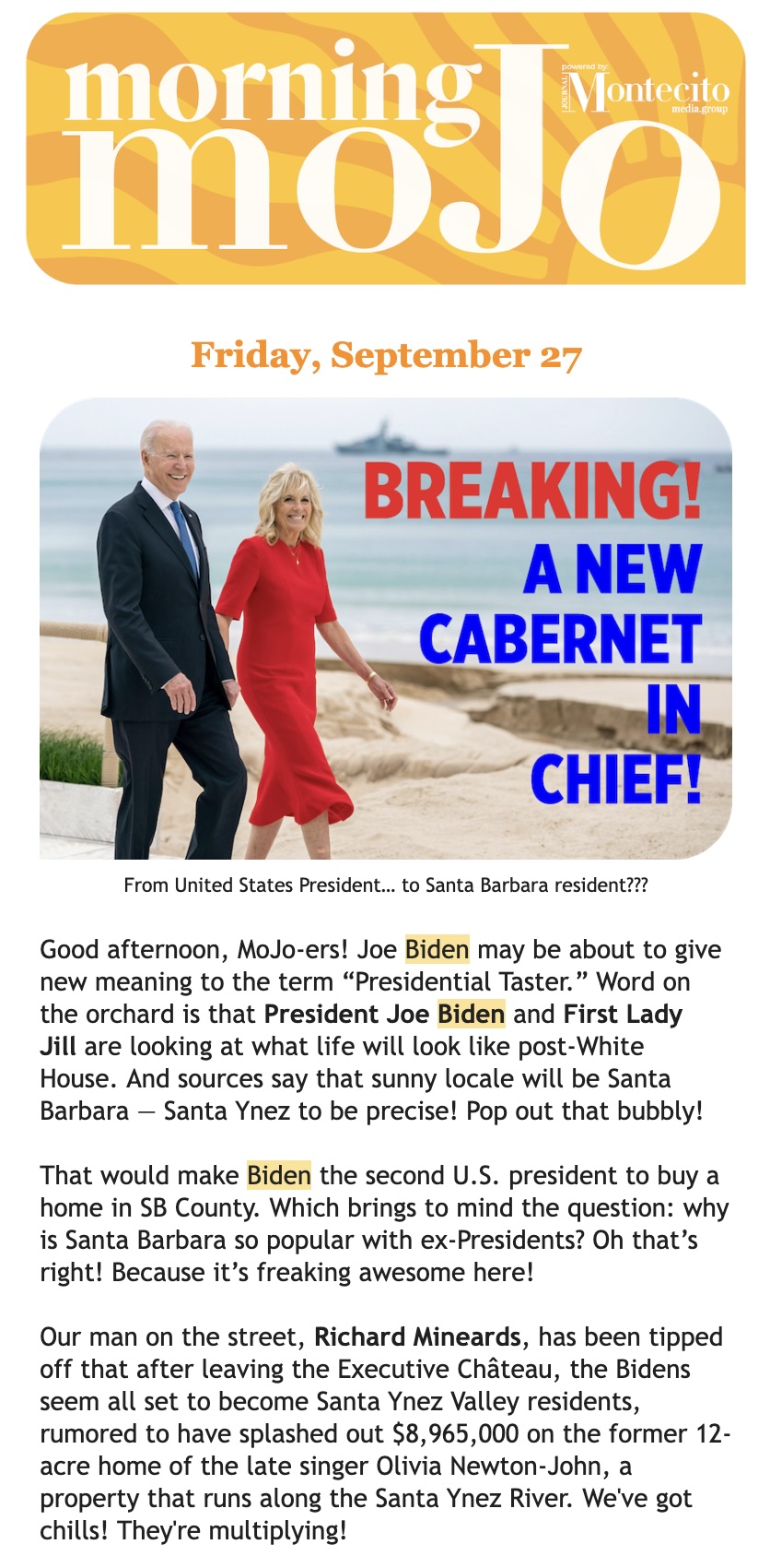 ••• The Montecito Journal sent out a “breaking news” email about how President Biden and Jill Biden were rumored have bought Olivia Newton-John’s former house in Santa Ynez. “But it seems this report has turned like a bottle of red wine,” said TMZ shortly after, “with Carey Kendall, the Newton-John family’s real estate agent at Village Properties, [insisting that] no one from the Biden family or the President’s camp has toured the ranch—ever!!!” Perhaps this will turn out to be true, but the listing is still live, and if the Montecito Journal issued a retraction, I missed it.
