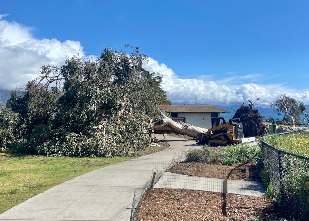••• Two giant eucalyptus trees fell at Shoreline Park (Independent)—thanks to Andrew for the photo—as did one of the beautiful stone pines on E. Anapamu (Edhat).