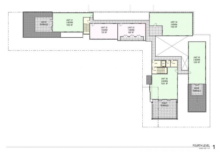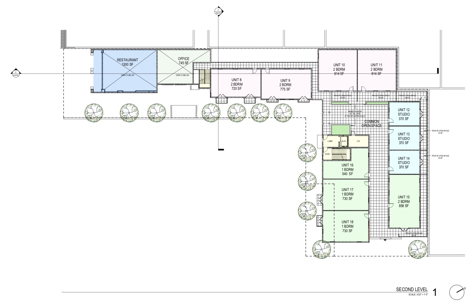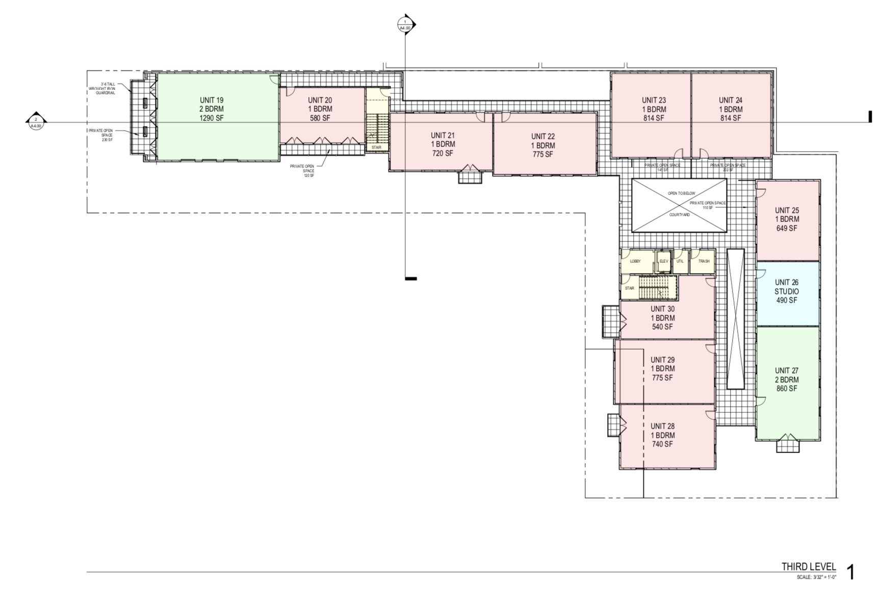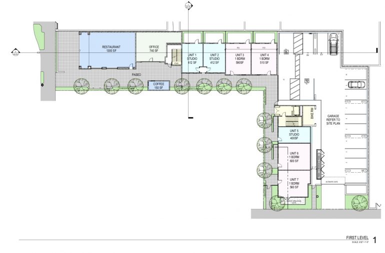In their place will be a building—the darker gray below—most of which is four stories, peaking at 48 feet tall. Kevin Moore Architect‘s design includes a paseo running from State Street through to E. Ortega, allowing for much more light for the apartments.