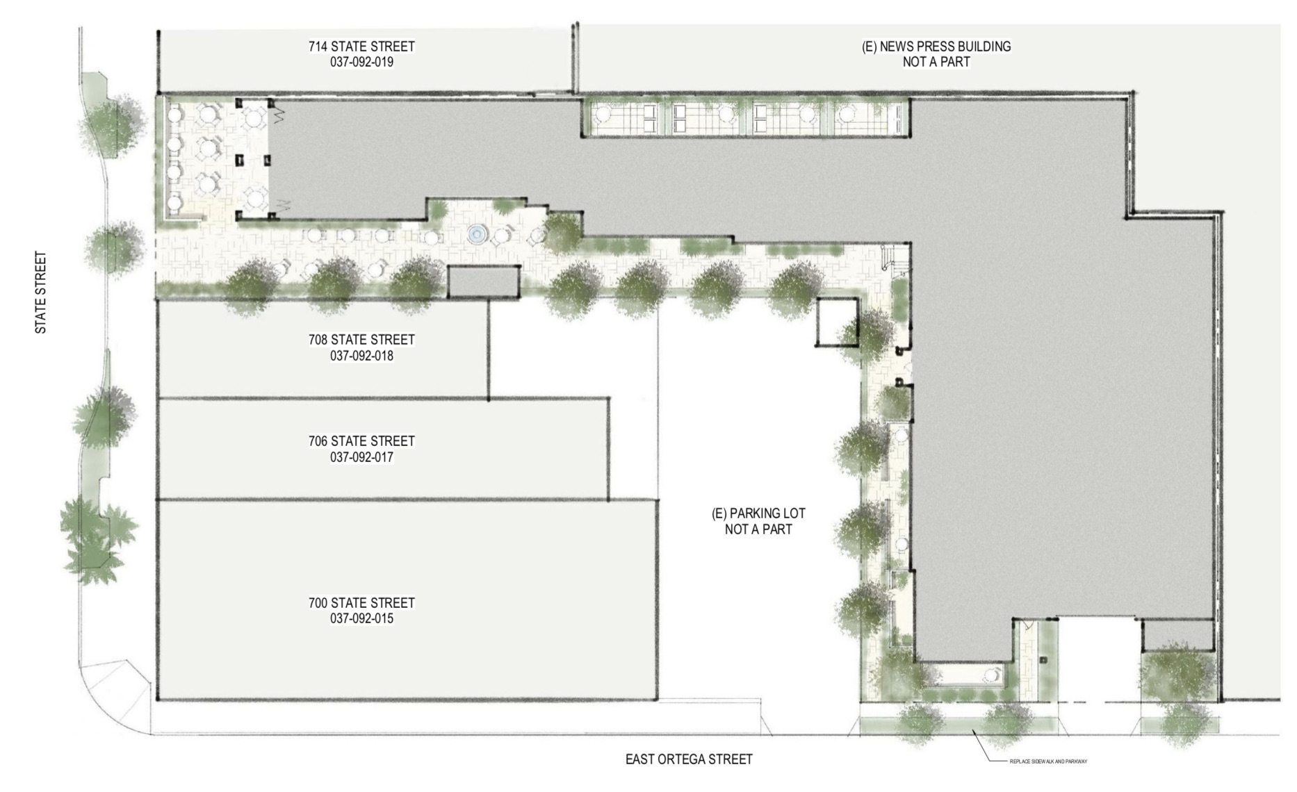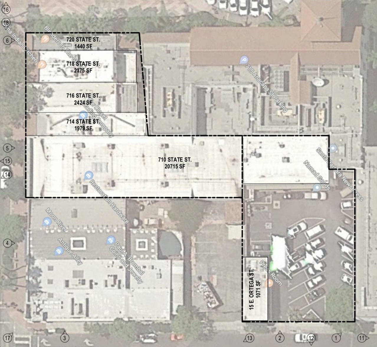 The lots in question are 710, 714, 716, 718, and 720 State Street (between De La Guerra and Ortega), along with 15 E. Ortega, which 710 State abuts to the east.