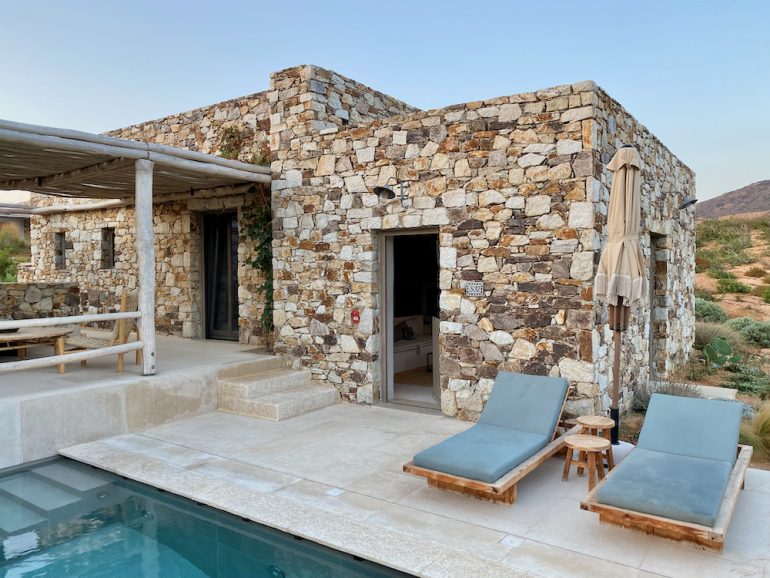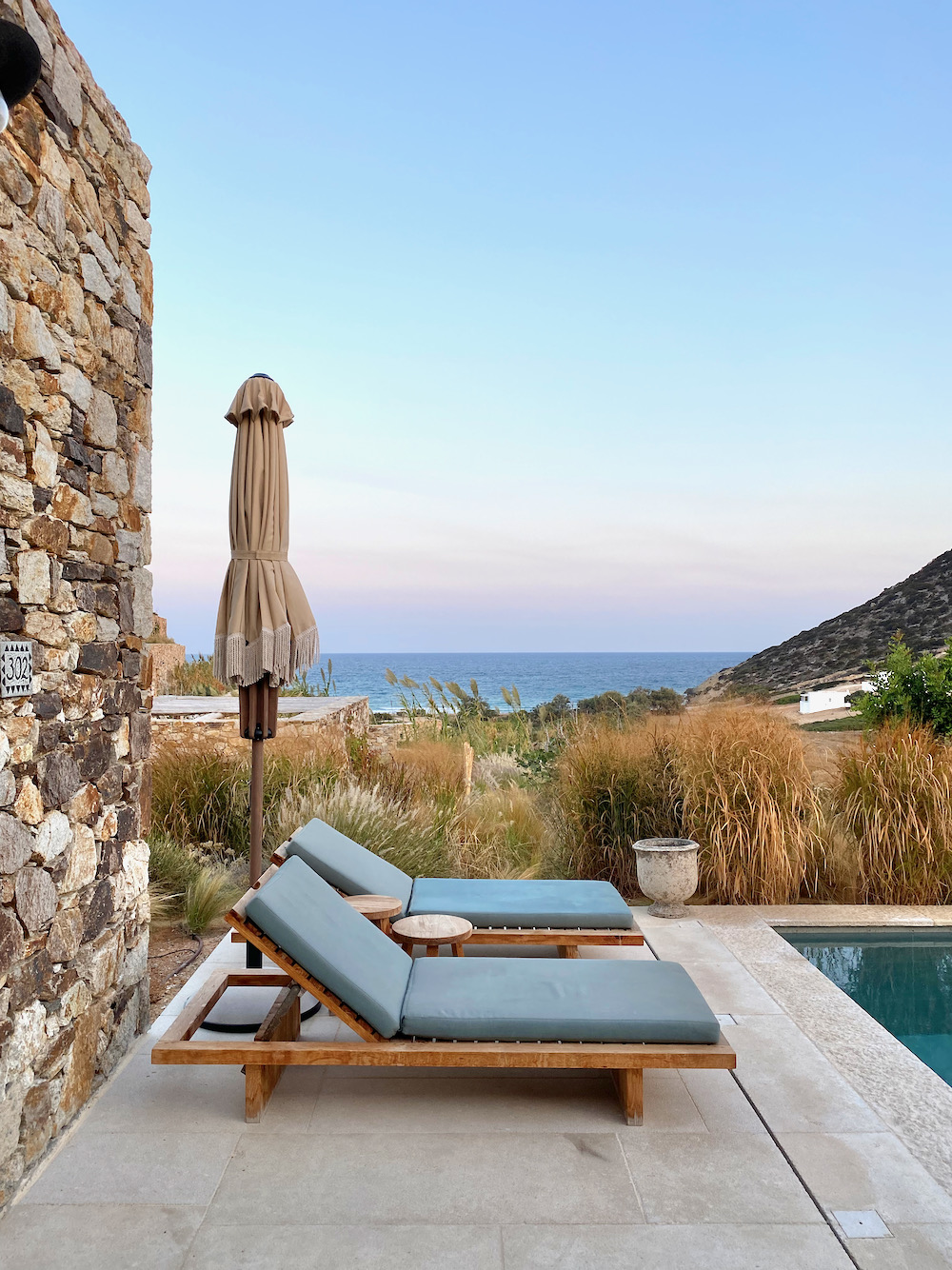 Anyway, on Antiparos we stayed at a brand-new resort called The Rooster, founded by Athanasia “Comninos, a stylish mother of two [who] left a career that included interior design, a stint at Vogue Greece, and working for her family’s shipping company to focus on this passion project seven years ago” (Town & Country). She clearly has exquisite taste, for the hotel is the prettiest one I have ever stayed at. It positively makes love to the camera. (Yes, there were other guests there.)