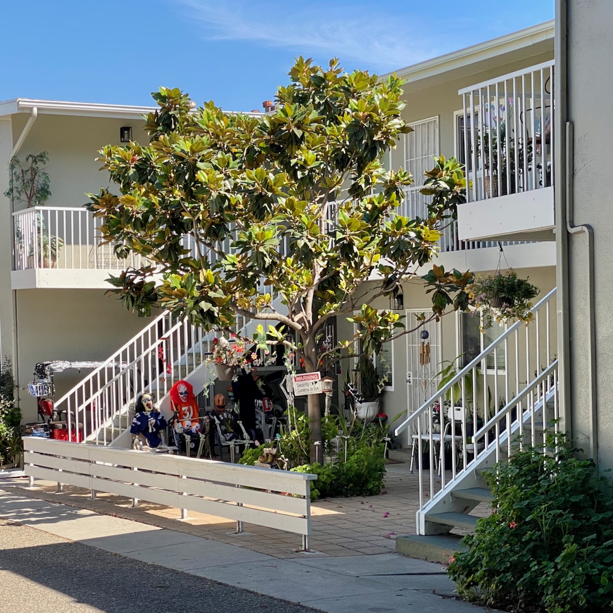 There’s a sexy little bungalow court at 823 Bath Street. I see a face in the distance, sticking out a very long tongue.