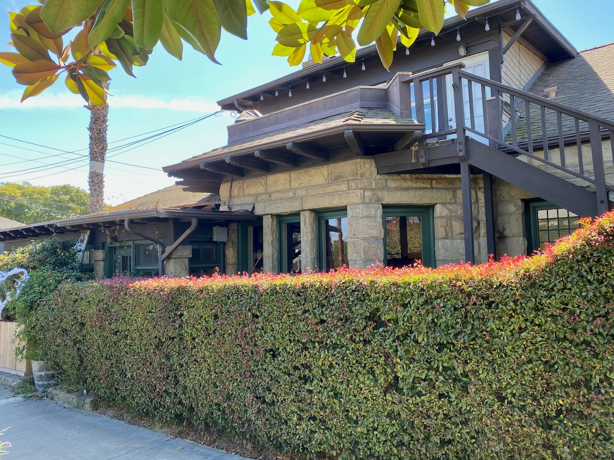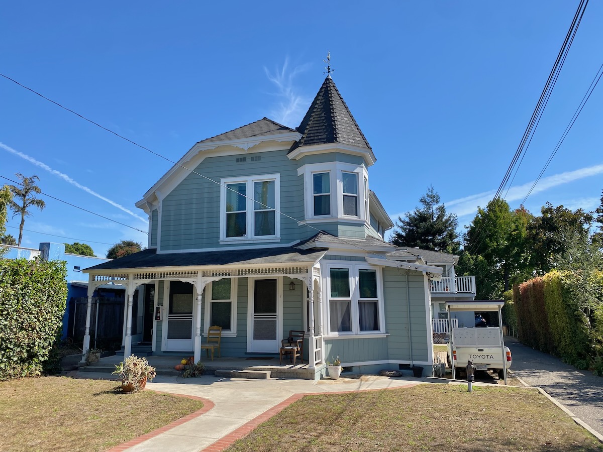 I had never noticed the log cabin at 1121 De La Vina. I thought it might be historically significant, but according to city records, it’s more of an impediment to enjoying the house behind it (1119 De La Vina): “The property has four buildings on the lot. The historically significant building is the two-story, Queen Anne style residence [that] has steeply pitched, cross-gabled roofs with lower gables on the corners of the front elevation. Under the front facing gable are three elongated one-over-one wood windows. The gables feature intricate fish scale shingle siding and the first floor is mainly comprised of wood weatherboard siding. The house features a turret attached to the corner with a polygonal shaped top. There is a log Cabin in the front of the house which covers the view of the first story of the Queen Anne house.” Here’s a photo from before the cabin ruined everything.
