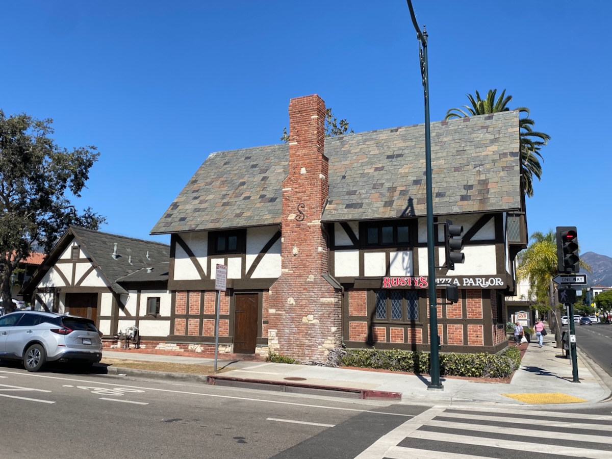 Commercial buildings run the gamut, too. The first one below, on W. Canon Perdido, feels like Newport Beach to me, and it would work better without the clunky portico. As for the Rusty’s Pizza building at 232 W. Carrillo, it apparently dates from 1973, when it was the site of a restaurant called Poor Richard’s Pub. Restaurant Guy commenters said that “the building was bought and reassembled on the site,” which I have not been able to verify, and Poor Richard’s served “good English food” such as Yorkshire pudding and mulled wine.