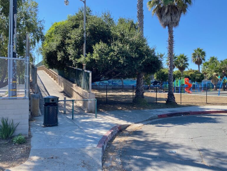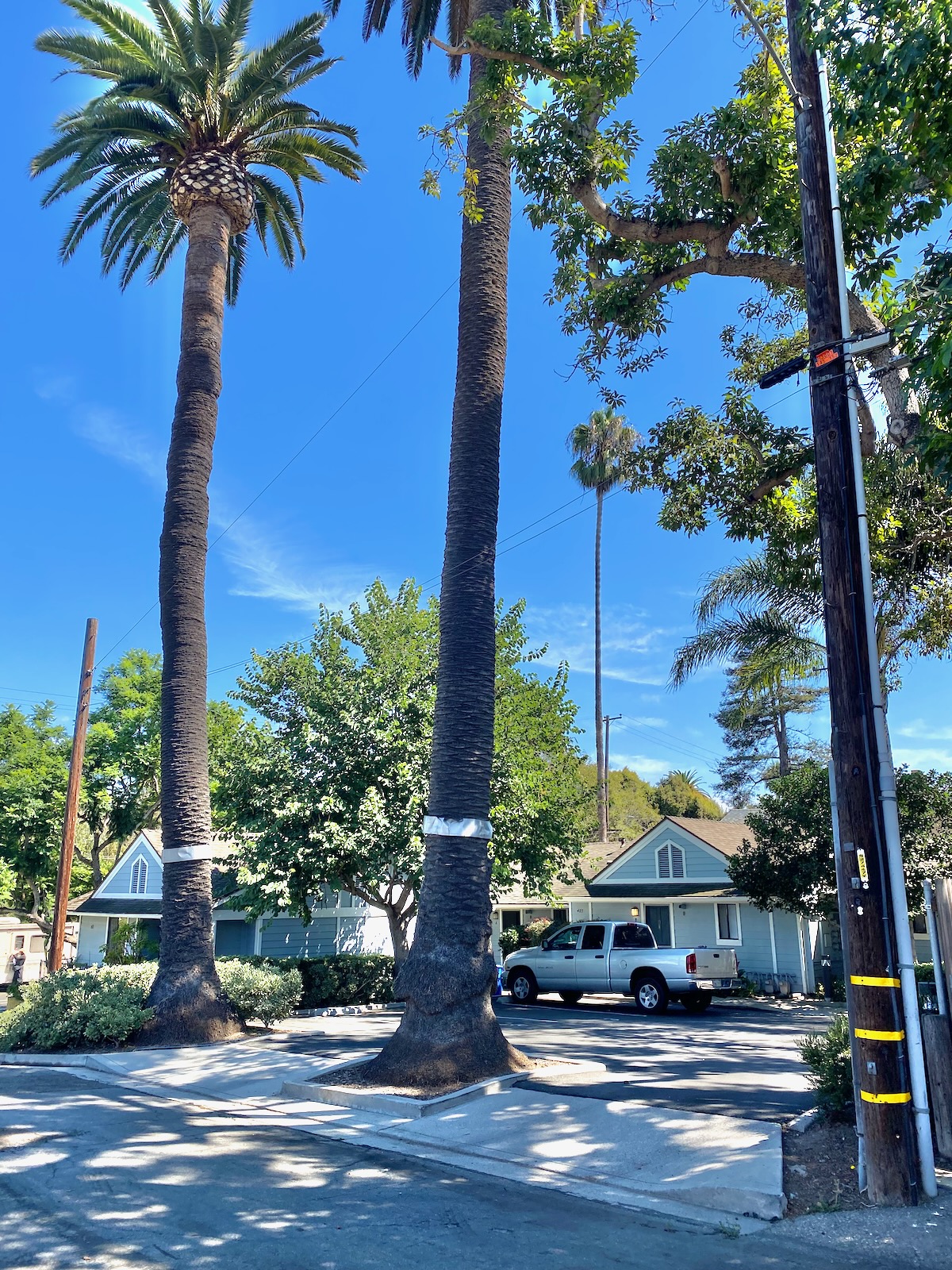 This part of town is similar to the blocks to the south, the subject of a previous walk. Then, as now, I was particularly intrigued by the street stubs created by the freeway. On Transfer Avenue, I admired the pair of regal palms gracing a driveway and the washer-dryers in a porte cochère. Very modern laundry, that!