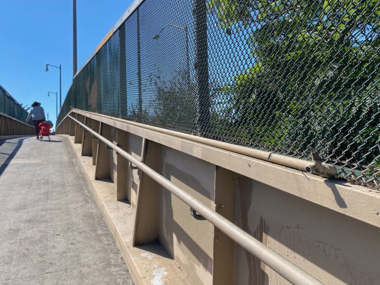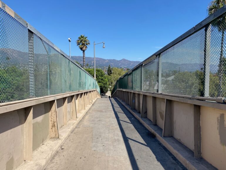 On Anapamu, I was puzzled by the city garbage cans in the middle of the block. They were in front of 415 W. Anapamu, evidently the home of Eagle Paragliding. Then I realized that there’s a pedestrian overpass at the end of Anapamu, which I honestly hadn’t known existed (and yes, that’s embarrassing to admit). I walked it halfway, took in the view of the freeway, and spent the trip back down wondering why there’s a water pipe running along most of the bridge.