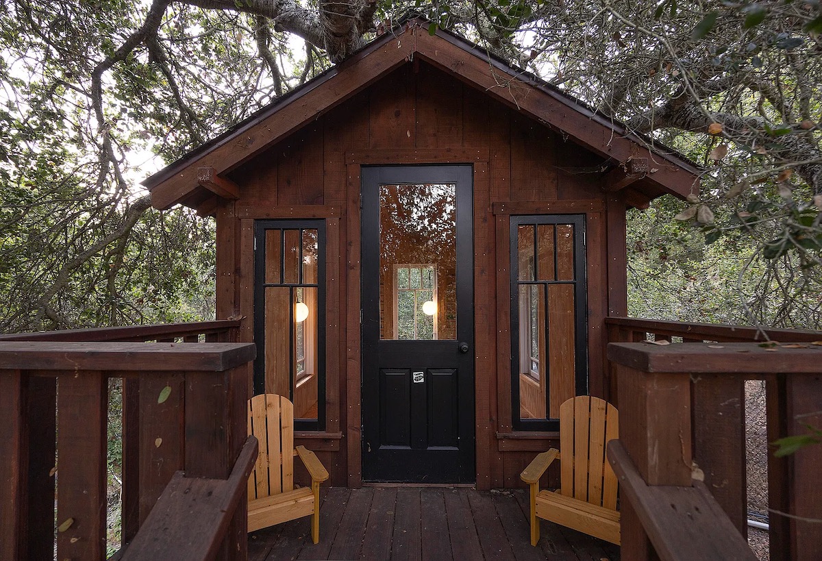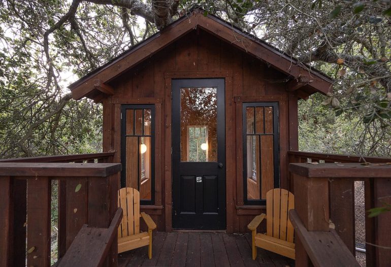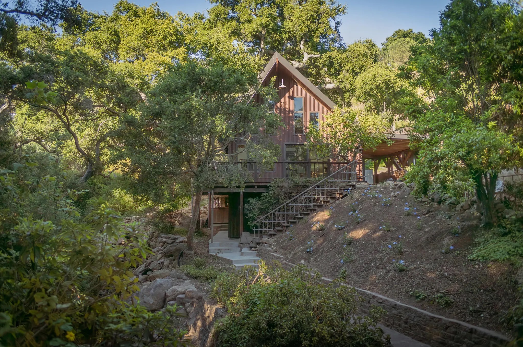 ••• 712 Ladera Lane ($2.395 million): Wooded two-acre lot in east Montecito with a two-bedroom, one-bath A-frame and an outbuilding with a half bath and outdoor shower (below).