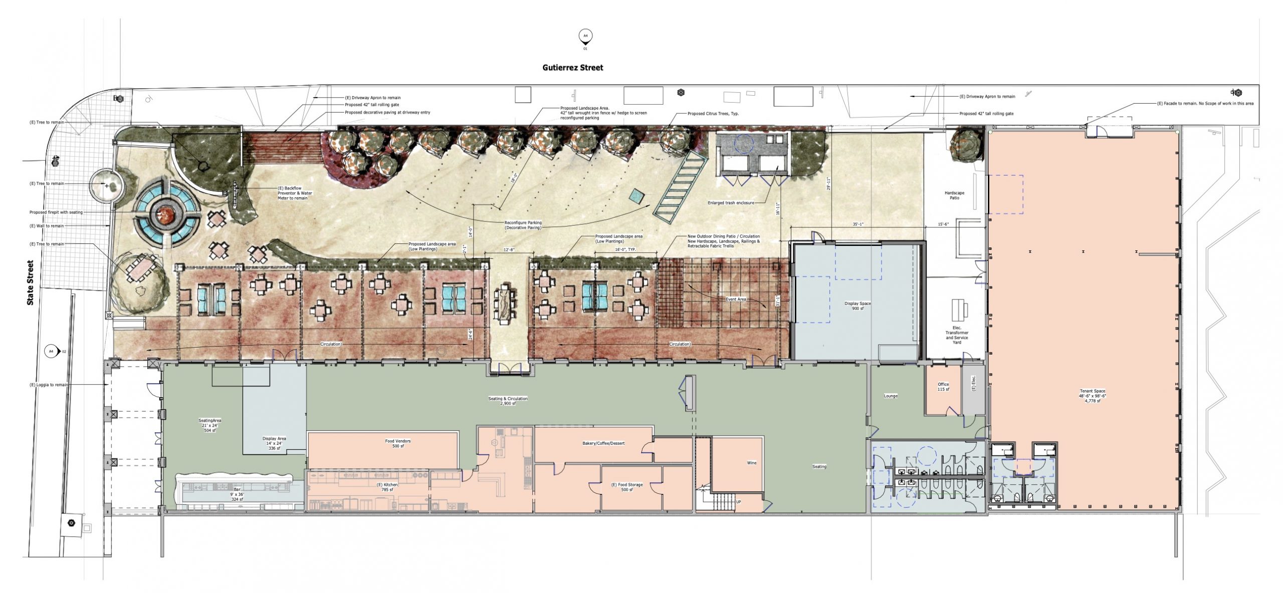 Proposal for adaptive reuse of the existing multi-tenant commercial building on a 28,211-square-foot site. Exterior improvements to the building include a new 900-square-foot garage addition and new HVAC equipment on roof. Site improvements include the conversion of a portion of the parking lot to a covered outdoor dining area, alterations to the landscaping and site screening, and a new trash enclosure and path of travel to meet ADA requirements.