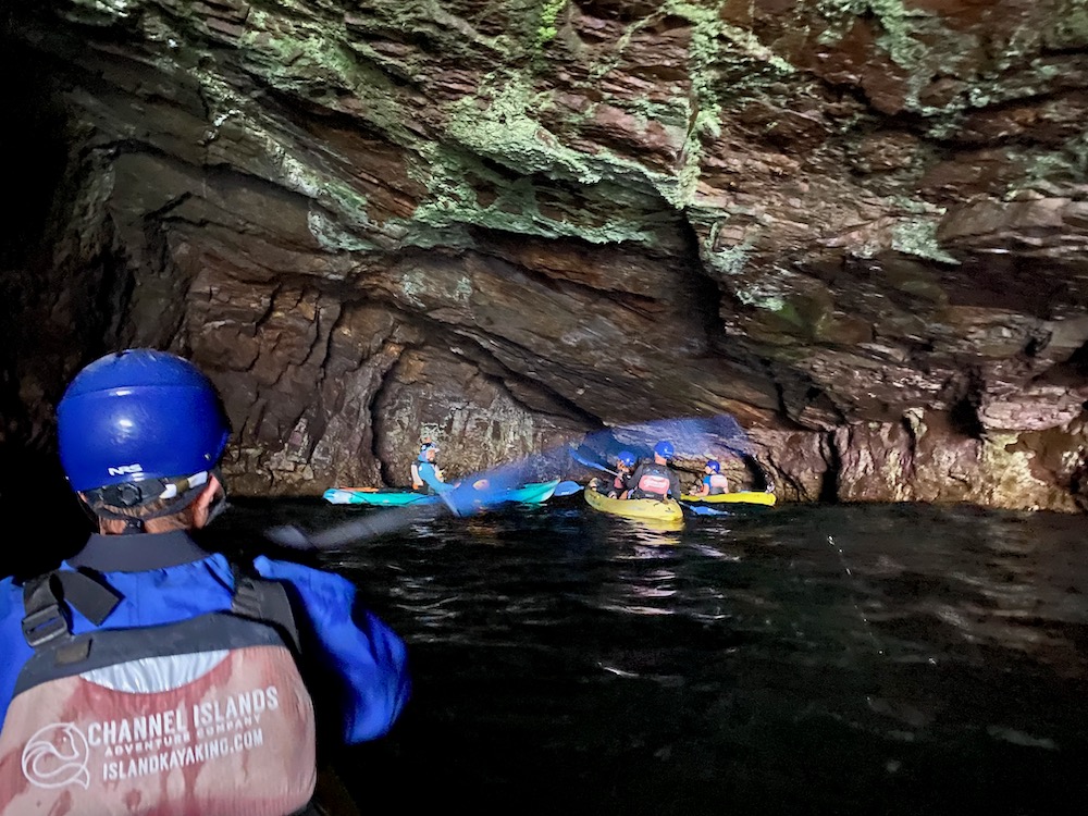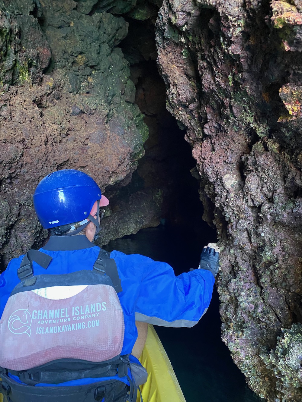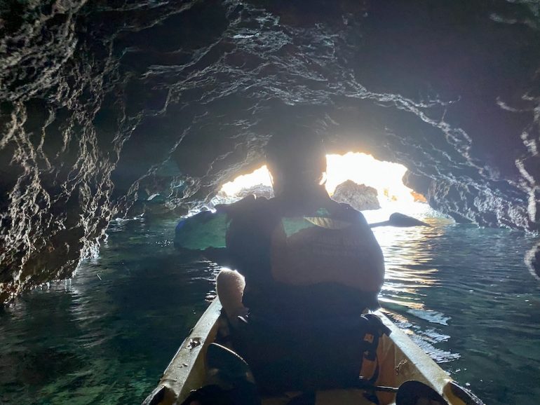I had been warned that were would be in a two-person kayak, which the company prefers because there’s less time waiting for your turn to enter a sea cave. But if I were to do this trip again—and no offense to my husband—I would try insisting on a single kayak. They’re simply more fun to maneuver. On the other hand, taking photos, particularly in the caves, was much easier knowing Adam could watch where we were drifting.