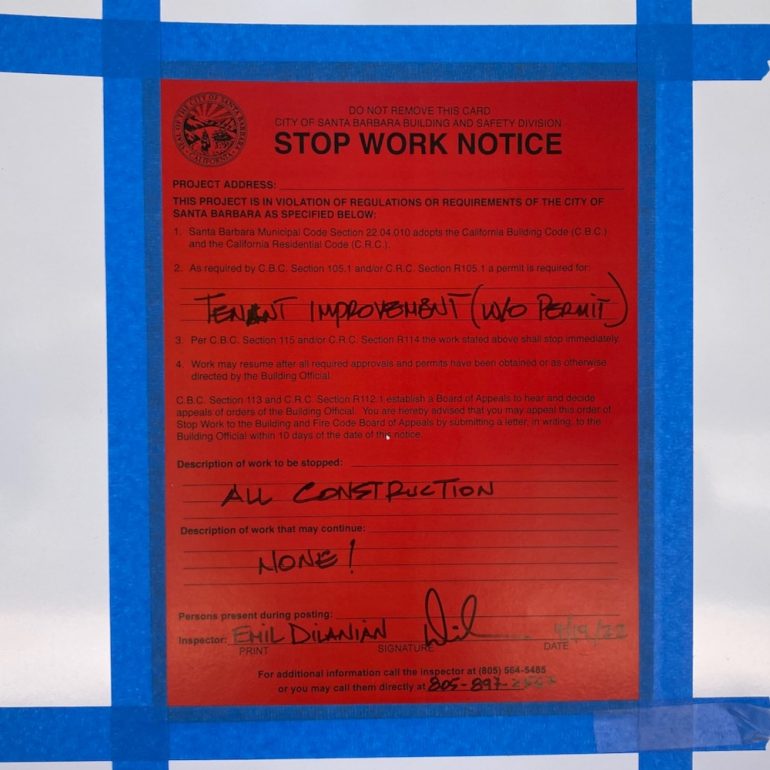 ••• Judging from the tone of the stop-work order at Alma Fonda Fina, the Corazón Cocina spinoff coming to the Montecito Country Mart, I’d guess it’s not opening anytime soon.