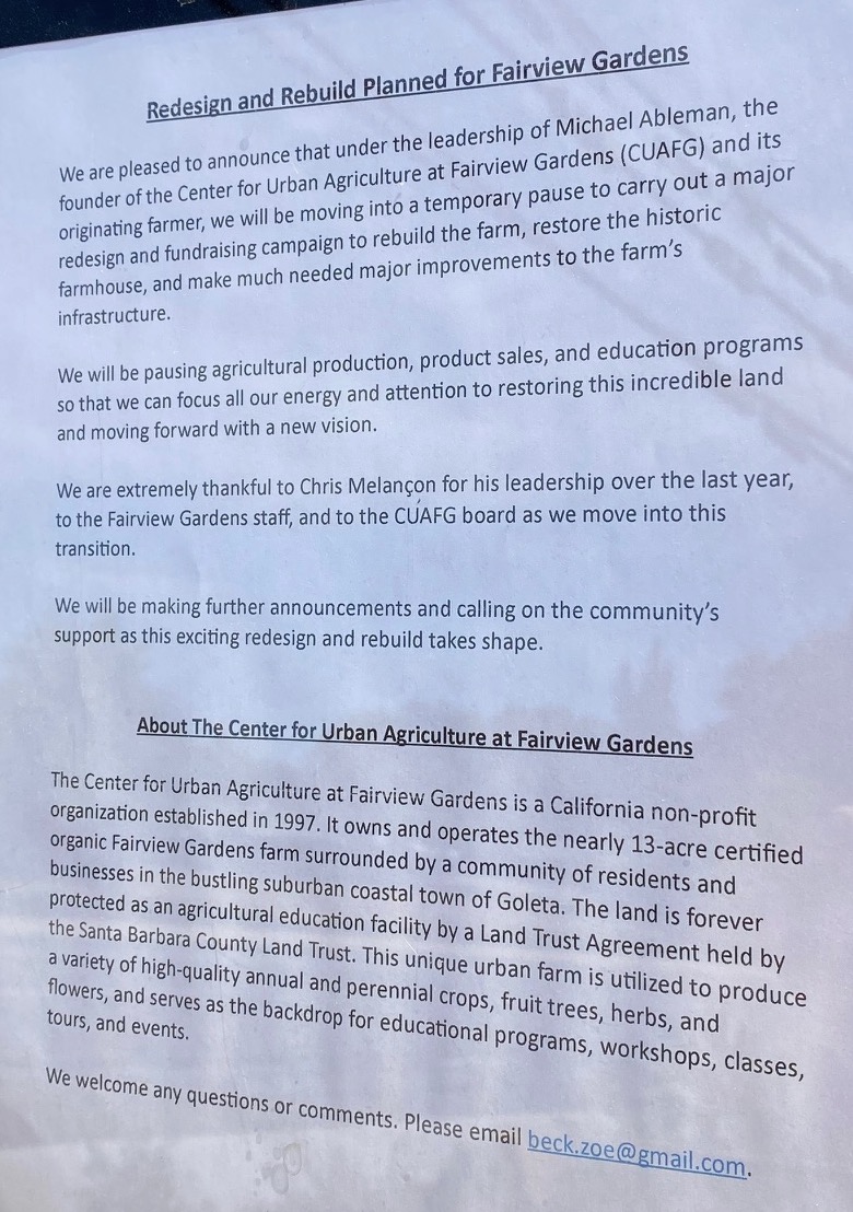 ••• “Word on the street is Fairview Gardens is shutting down at the end of the month,” commented Tracy the other day. “I’m told that employees were given very little notice and are still in shock. It’s my understanding that the property can only be used for non-profit purposes. Sounds like the new owners wants to shut down for the near year to work on infrastructure. Can you please confirm?” The farm didn’t wait till month’s end to temporarily close, as you can see from the photo I took yesterday. Here’s the gist of the explanation posted at the site (but not on social media…?):