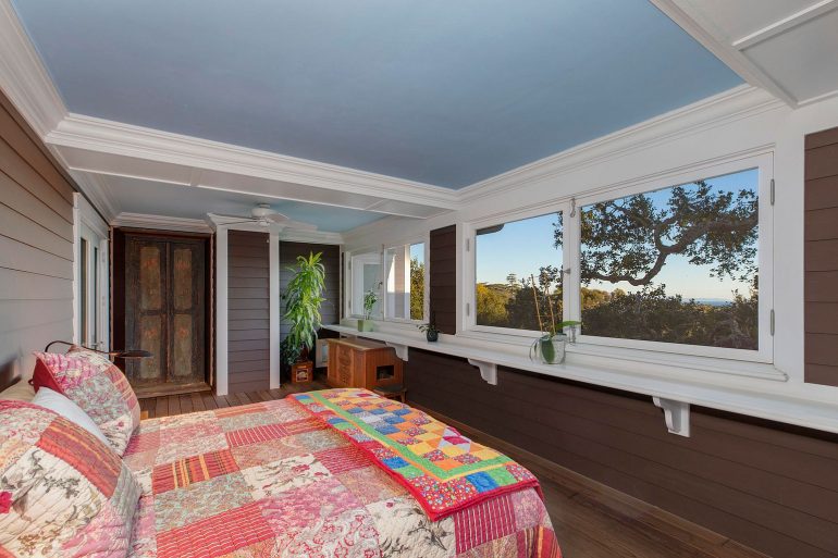 857 Picacho Lane (↓$986K to $7M) was the property that taught me something about the phrase “dream home”—i.e., it usually means that whoever built it made idiosyncratic choices that the broker can’t really explain otherwise. That could mean the gingerbread facade, the pair of offices, the media room with windows at the ceiling, the sleeping porch (below), the lack of a pool…. One thing I definitely loved was the fireplace on the front porch.