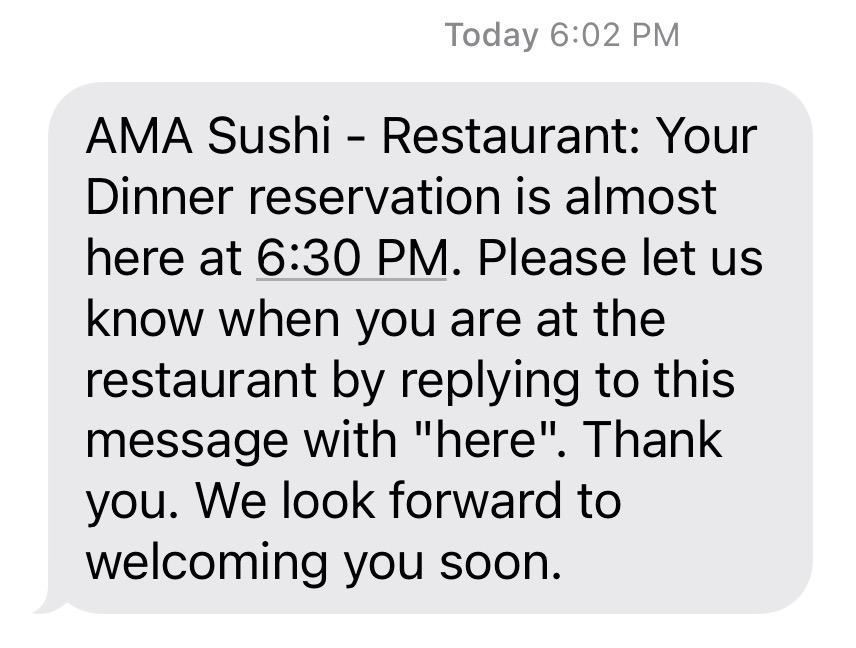 AMA and I got off to a bumpy start when I received this text message a half hour before our reservation. I asked the two hosts what the point was, and they said they had no idea and that most people ignore it. One on hand, it’s funny and who cares? On the other hand, the more expensive the establishment, the more I expect from it. And as my husband likes to say when I complain about anything technological: just change the setting, babe.