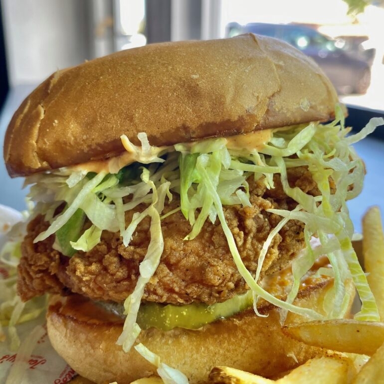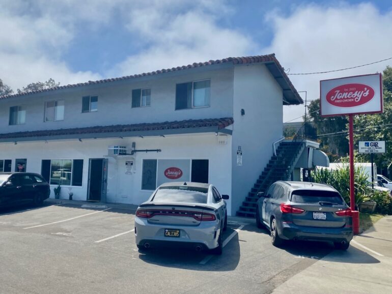 ••• Some first impressions of Jonesy’s Fried Chicken in Goleta…. The JFC Original Sandwich was pretty amazing, and I say that as someone who doesn’t often order fried chicken sandwiches. The chicken was juicy and flavorful, and the housemade pickles added real zing. (I may go back for a jar or two.) The sandwich was also substantial; I ordered the fries and the buttermilk slaw, and I didn’t need either of them. While the sides get props for only being $3.50 each, my fries came out cold, and I was the second person to order right as the restaurant opened at 11 a.m. P.S. Jonesy’s has a few parking spots (marked “JFC”) in the lot. P.P.S. I got a good tip before going, which is to avoid Wednesday lunch, if possible, because that’s the day all employees at nearby Yardi are expected to show up at the office—and they’re understandably excited about having Jonesy’s right there. On the other hand, the restaurant now has online ordering, so you can skip the line….