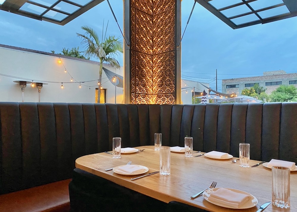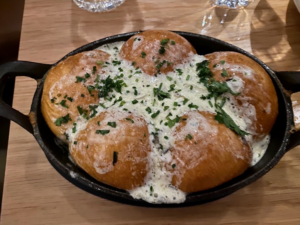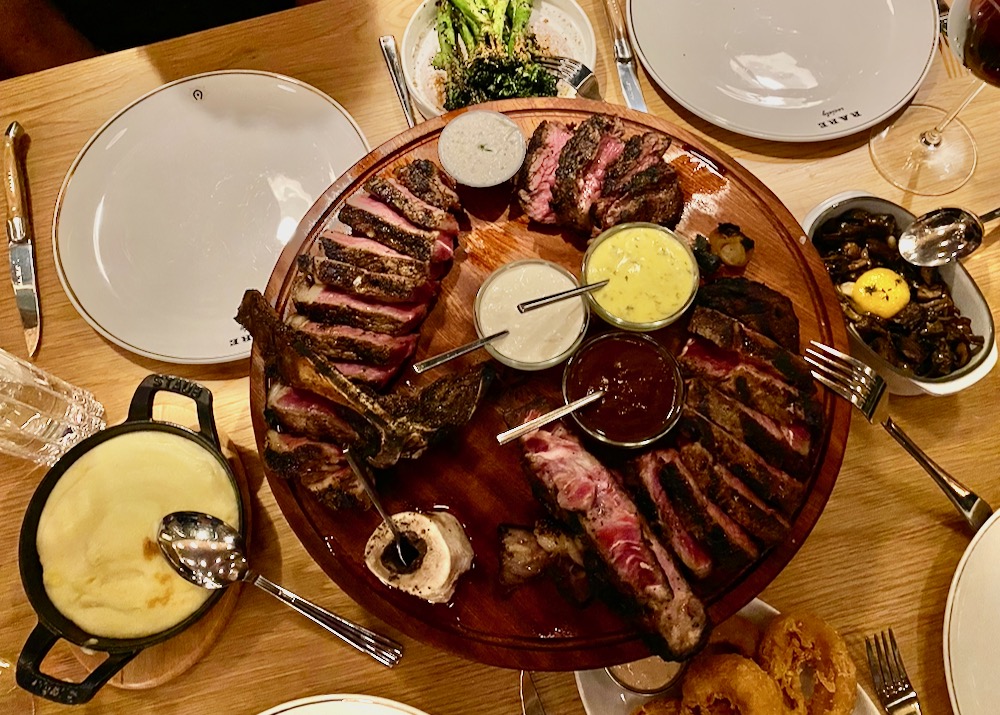 ••• The Funk Zone outpost of San Diego steakhouse chain Rare Society has glitz and buzz: the room is barely recognizable as the former site of the Project and Captain Fatty’s, and perhaps because it was Saturday night, there were many boisterous groups of all women or all men. We arrived a bit early, so we were told to wait at the glamorous horseshoe bar along the State Street side, where we ordered after a quick glance at the cocktail menu. The signature old fashioned, it turns out, includes “dry-aged fat-washed bourbon” and is garnished with a cube of bacon fat wrapped in lardo. (The drink tasted like a meaty glazed doughnut.) It was a harbinger: even for a steakhouse, this is extremely rich food. Almost everything is gilded in butter, cream, cheese, egg yolk, oil, or beef fat. The rolls were so gooped up with butter that they required knife and fork; the lettuce in the Caesar salad was barely visible under a mountain of shredded cheese, and it came with breaded, deep-fried anchovies. The four of us shared the Executive Board ($192), a sampler of filet mignon, New York strip, and ribeye, and the beef was excellent and perfectly cooked. Perhaps there’s a way to navigate the menu without feeling like you’re on a binge, but just in case, make sure you’re stocked up on statins.