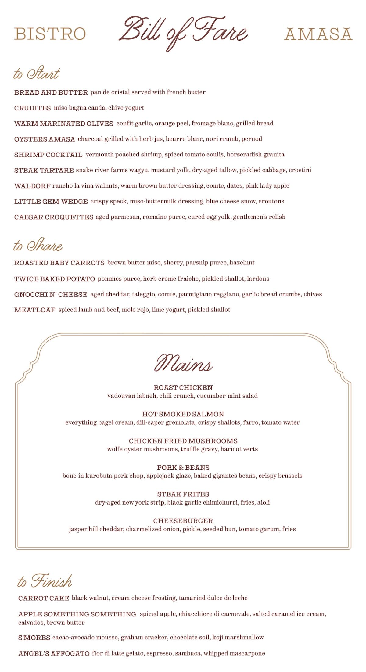 ••• Bistro Amasa, from Hearth Hospitality Group and Julian Martinez and Jesse Gaddy of Barbareño, opens for dinner November 14 in the former Louie’s California Bistro space at The Upham Hotel (De La Vina/Sola). Here are the menu and some photos by Erin Feinblatt to whet our appetites. I’d order the Apple Something Something dessert just for the pleasure of saying it.