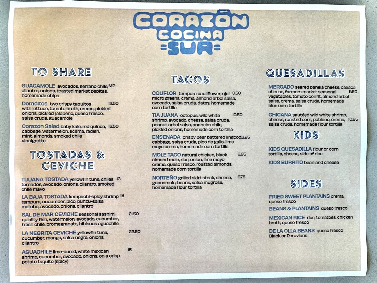 Corazón Cocina Sur is relatively small, with much more seafood on the menu than at the other Corazón establishments. (This is the soft-opening menu, and it will change over time.)