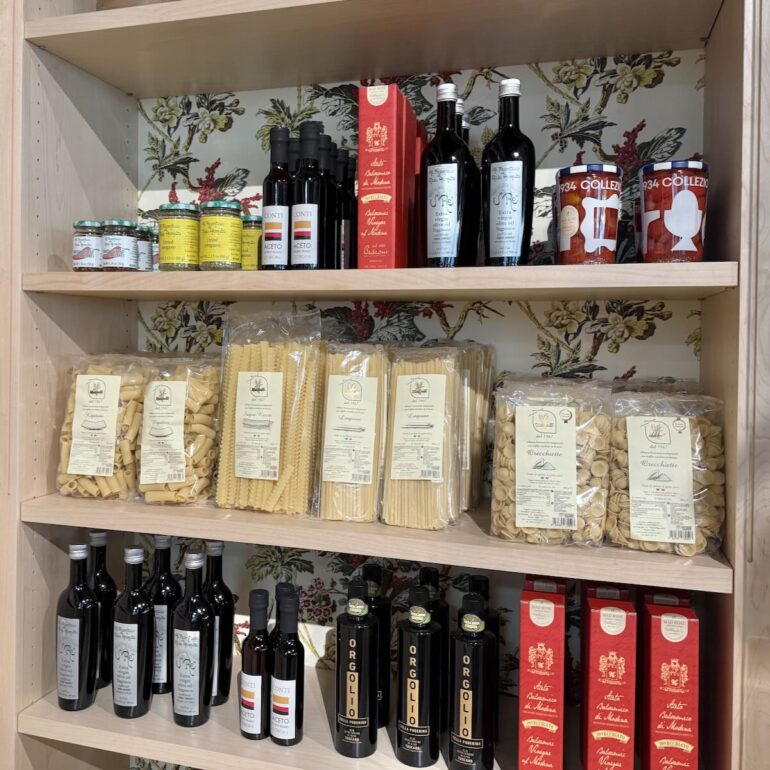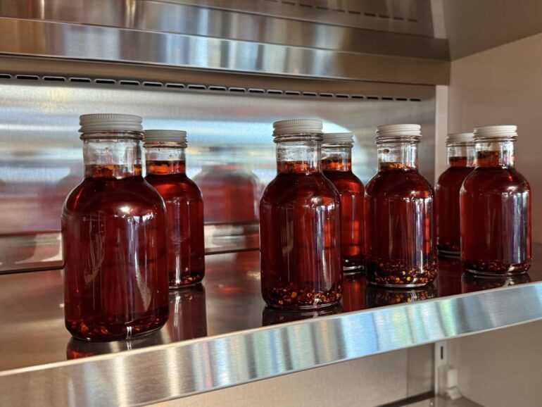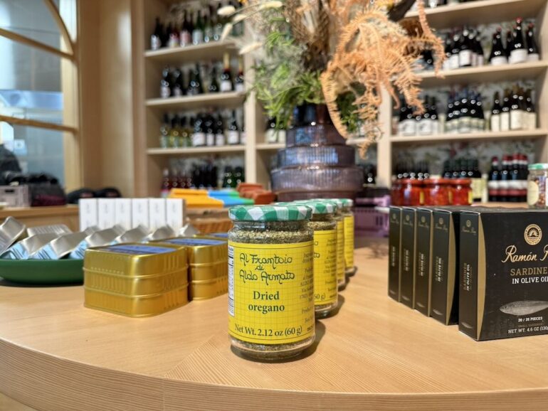 Tina’s Pizza is off the street, with a long counter of dedicated seating. (As with all of these places, you can also eat in the public areas.) The main way Tina’s differentiates from its big sister—besides that it’s counter-service with runners bringing out the food—is that there’s a provisions shop with wine, Italian specialities, tinned fish, chocolate, and more. The refrigerated case is a work in progress; eventually, it will have salad dressings and grab-and-go options, along with the chili oil pictured below.