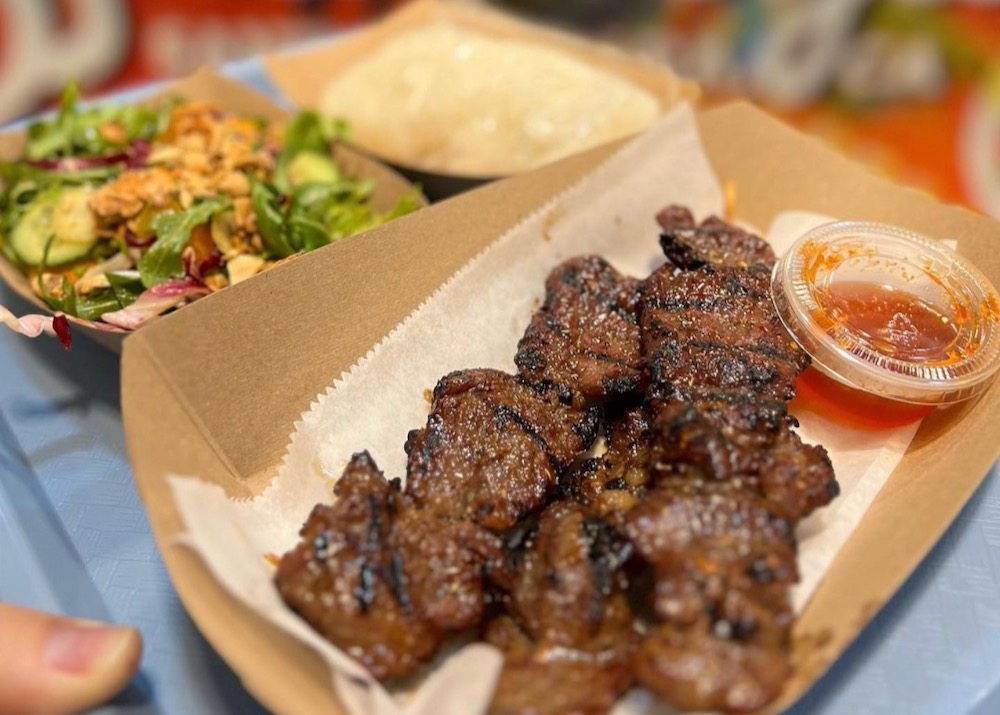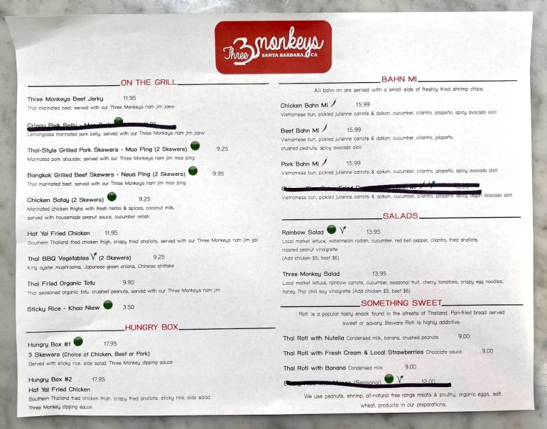 ••• Three Monkeys, from the Empty Bowl folks, has opened at the Santa Barbara Public Market, reports Restaurant Guy. The menu online doesn’t have prices, so I went over and took a photo. Above: neua ping (beef skewers).