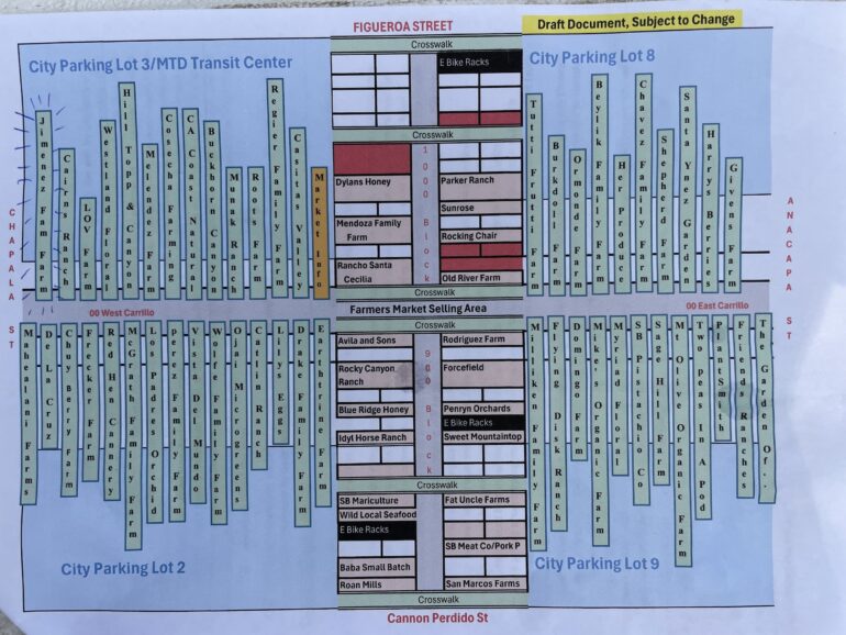 ••• As you likely know by now, the Saturday farmers’ market moves to the intersection of State and Carrillo on September 28. Here’s the preliminary map of who will be where. I hope the organizers will keep the passageways as wide as possible.