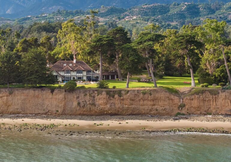 Spanning over 4.3 flat, park-like acres on two parcels, the estate at 3055 Padaro Lane boasts a staggering 350 feet of dramatic, private bluff overlooking the Pacific. Bright, beachy interiors grace the three-bedroom main house and separate guest studio. Well-proportioned rooms offer ocean views and invigorating breezes, with wonderful indoor-outdoor living throughout. The sprawling lawns and historic specimen trees are nurtured by a private water source. Plans to reimagine the existing home and create a guest house and pool on the second parcel are in final review. | Offered at $59,995,000.