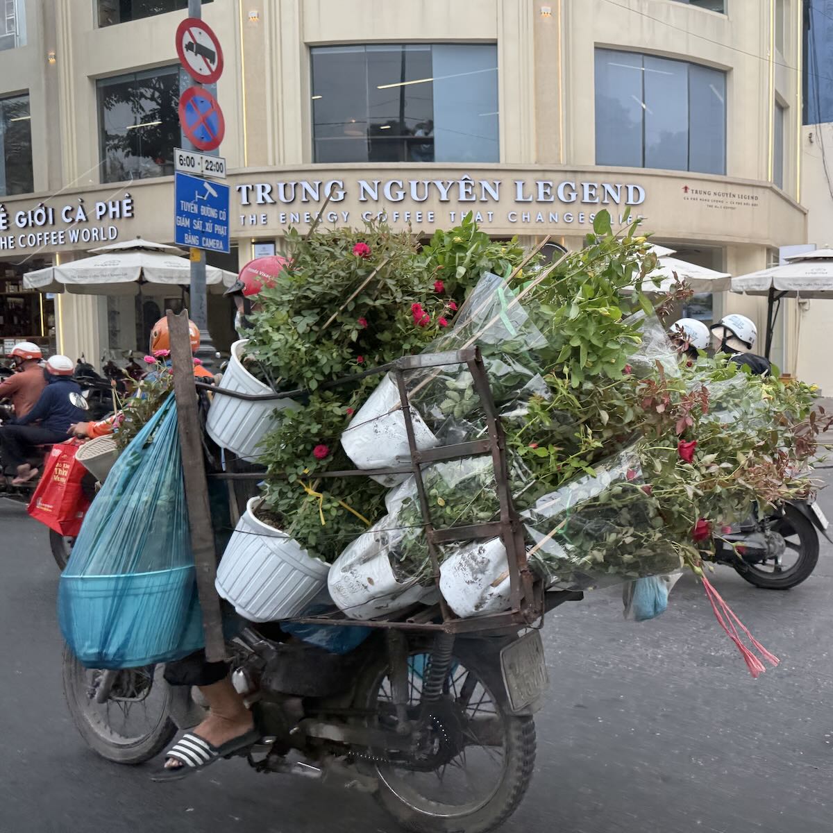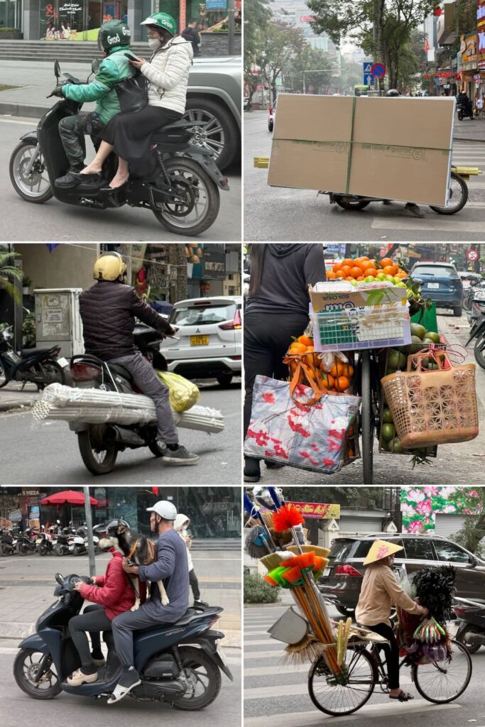 Their buzzing and beeping is constant. Whenever we were in a car, I occupied myself by marveling at what people carried on a scooter or bike. (You can even rideshare the back of a moped.) Besides the examples below, there were a pair of French bulldogs sitting on the seat, a widescreen TV, a 20-foot-long pole, a plastic bag with goldfish dangling from the handlebars, and a lot of plants….