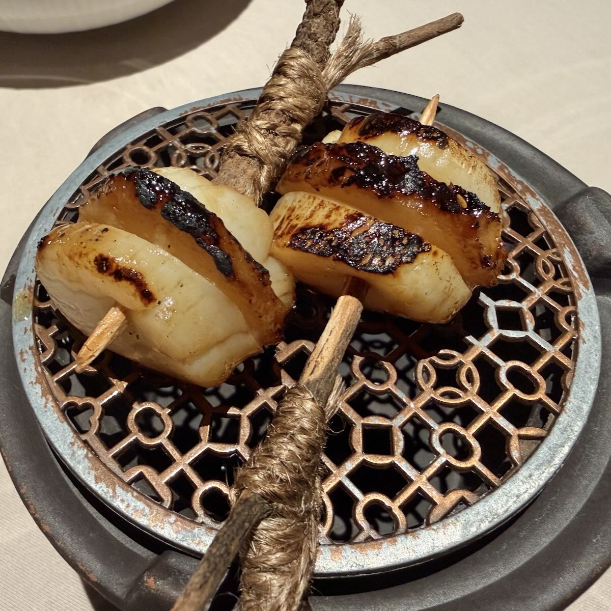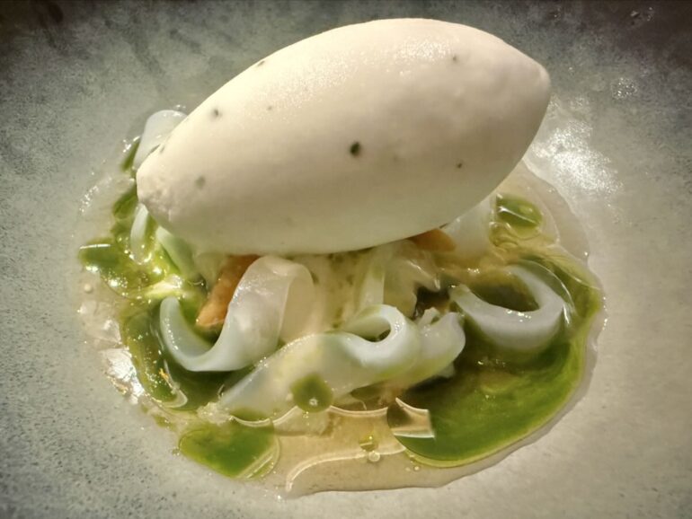 Unable to get a reservation at Gia, we went instead to the impressive Chapter Dining, where the tasting menu included scallop slices sandwiched between kohlrabi (below) and fish in a sauce of fermented rice beurre blanc that Adam is obsessed with replicating. Fancier Vietnamese restaurants tend to leave printed materials about the establishment and its dishes on the table. One card at Chapter Dining began, “When we think back to after-work bondings, we inevitably remember plates of coconut-stir-fried snails….”