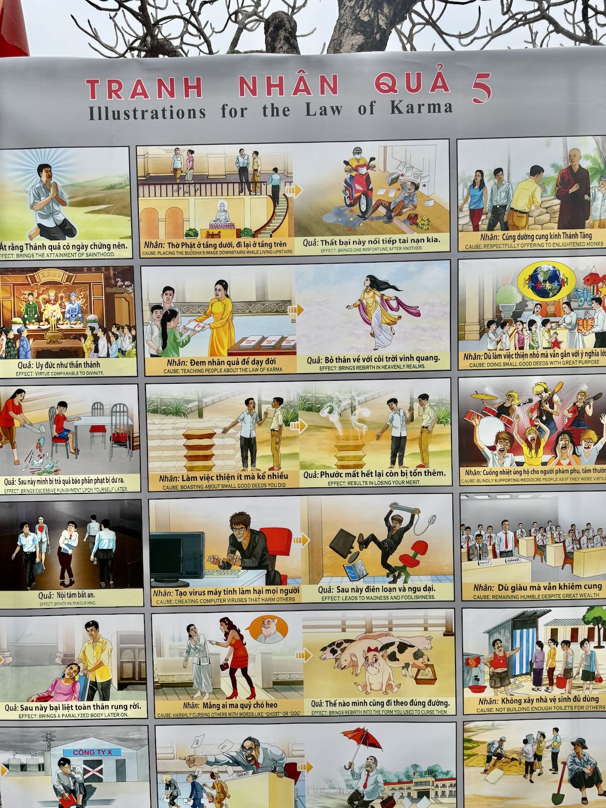 I quite enjoyed the nearby “Illustrations for the Law of Karma,” which would make fantastic wallpaper. To paraphrase one: “Preventing others from doing good deeds […] brings a paralyzed body later on.”