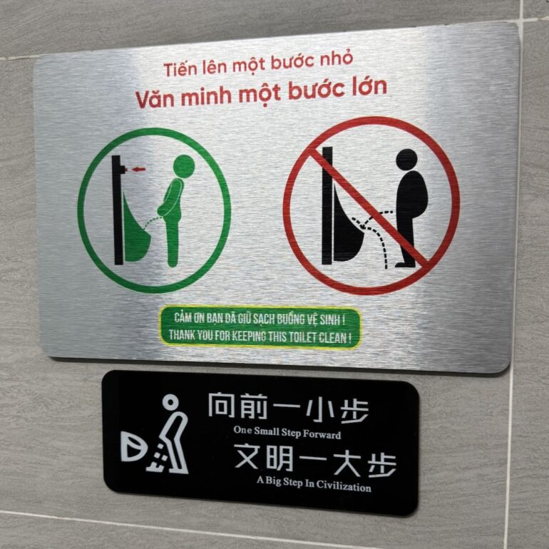 Lunch was at a restaurant specializing in chicken pho. Our guide enjoyed the food more than we did, and we enjoyed a sign in the men’s room more than he did.