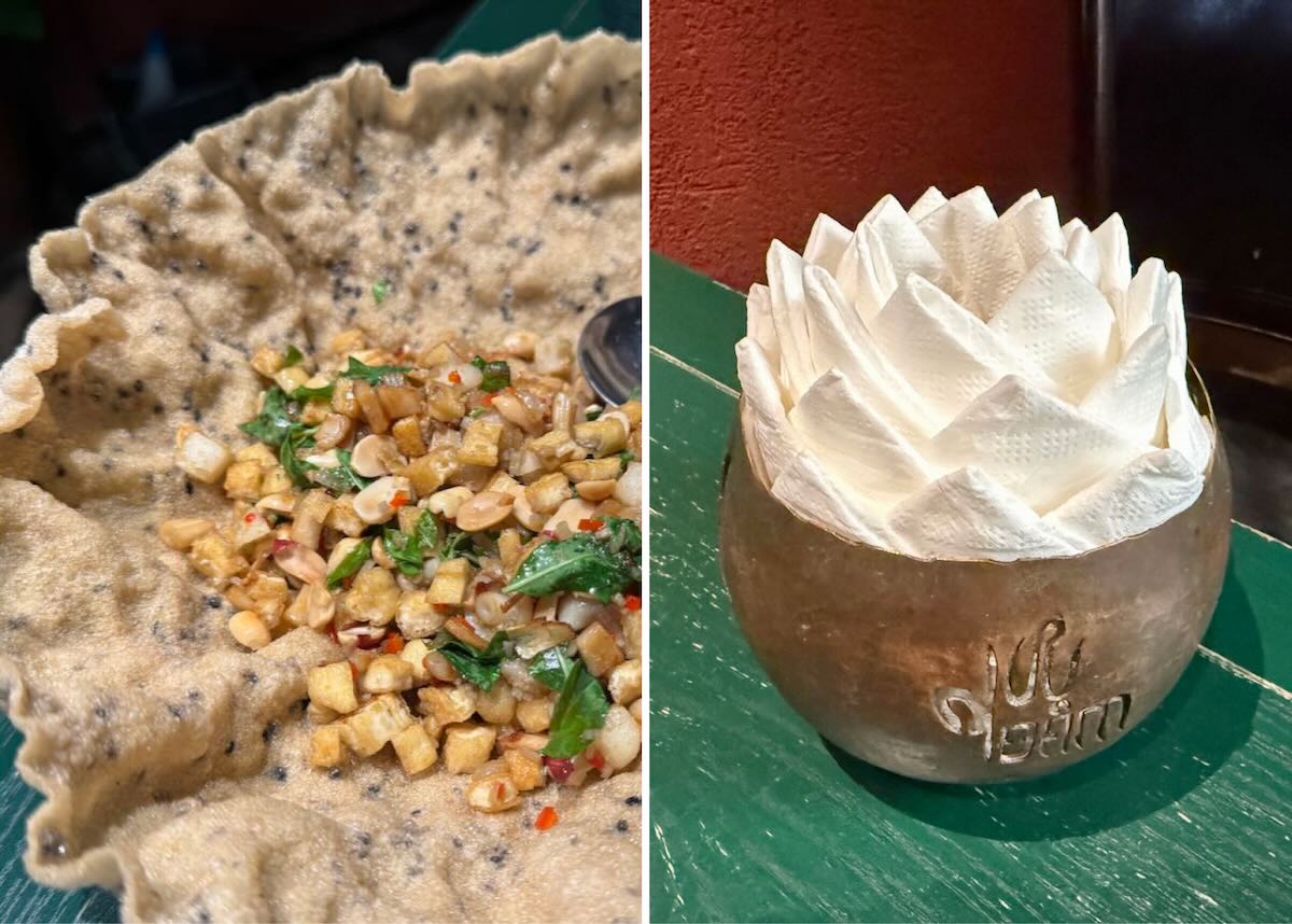 The restaurant also gave us a handout with its proprietors’ favorite restaurants (page one, page two), and we had lunch at one of them, a vegan place called Ưu Đàm Chay. The food was tasty—that’s a tofu-and-peanut dish in a rice cracker “bowl”—but the staff stuck us in a room by ourselves, possibly as punishment for being foreign. At least I could take photos of the napkin arrangement without being observed.