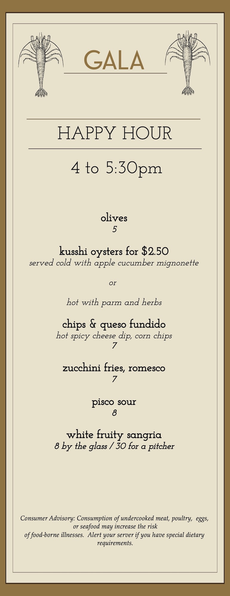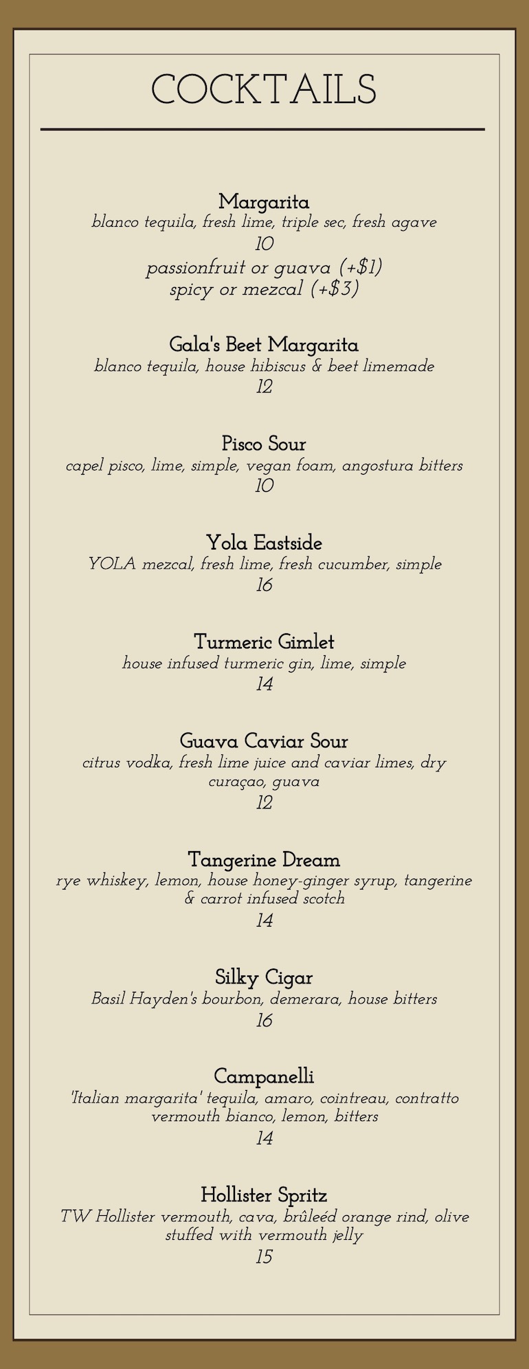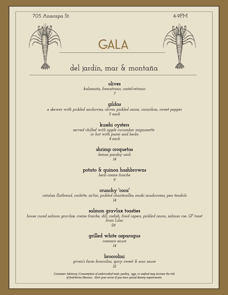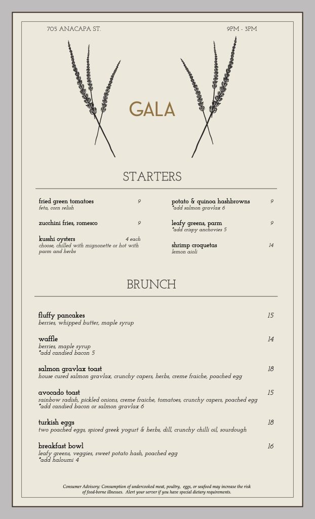 Gala is currently open for dinner Wednesday through Saturday, 4 p.m. to 9 p.m. Weekend brunch service should begin in a few weeks (see menu below), followed by breakfast and lunch. Reservations can be made via the restaurant’s website or Instagram, and Penke says they’ll always save space for walk-ins.