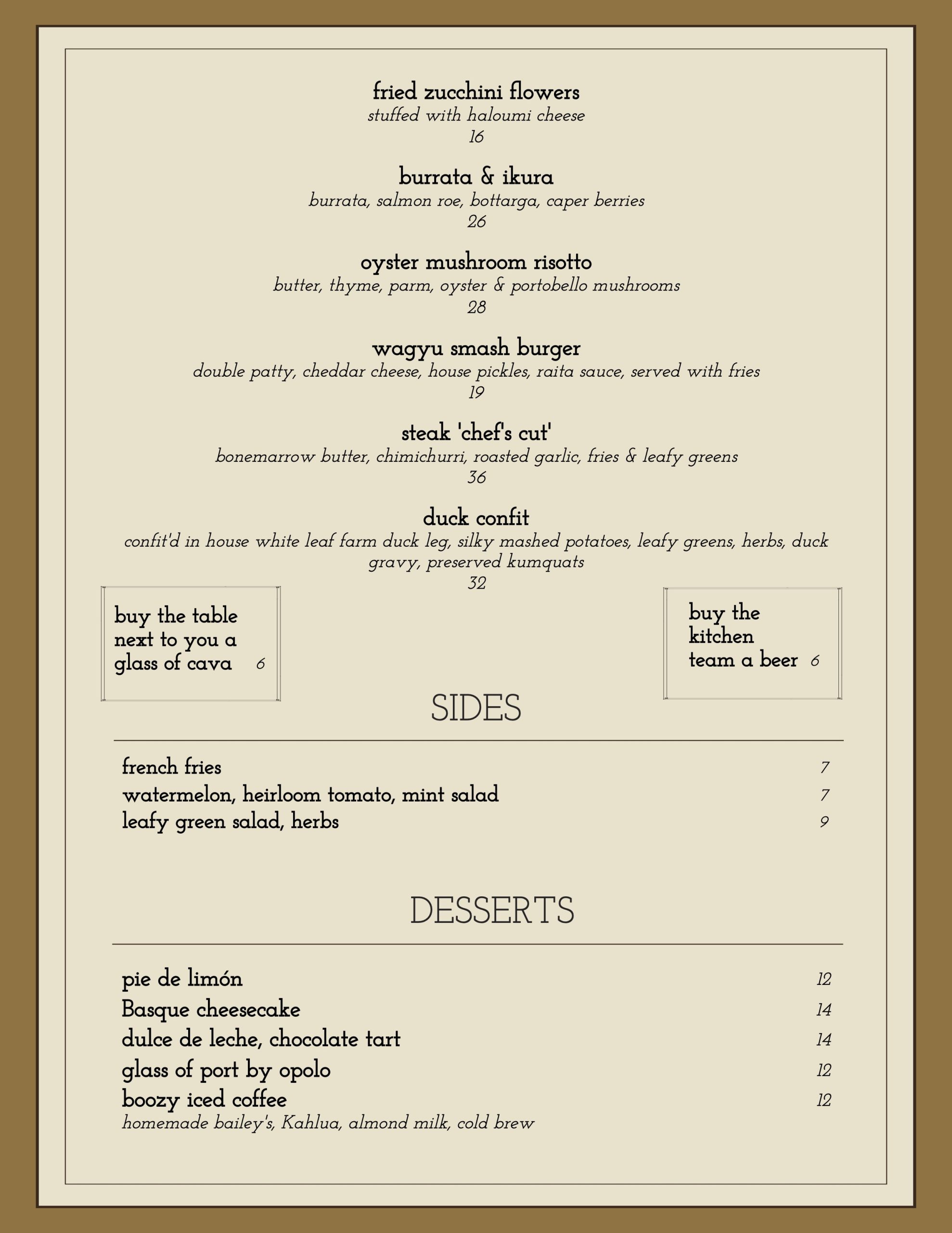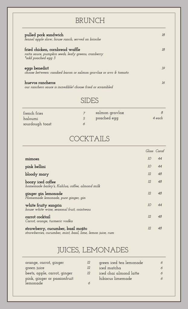 Looks lovely! Congratulation! Not to be obnoxious, but the brunch menu says 9pm – 3pm…fyi to the new owners, if you’re reading this.