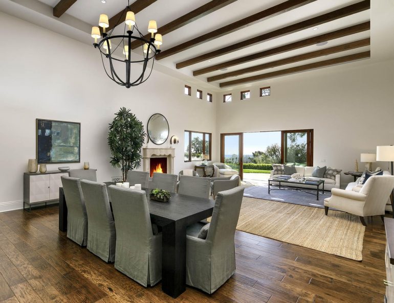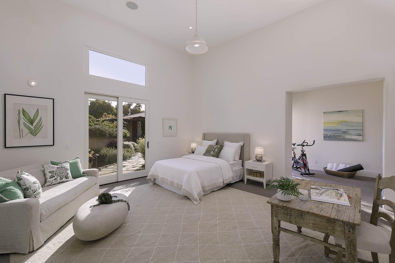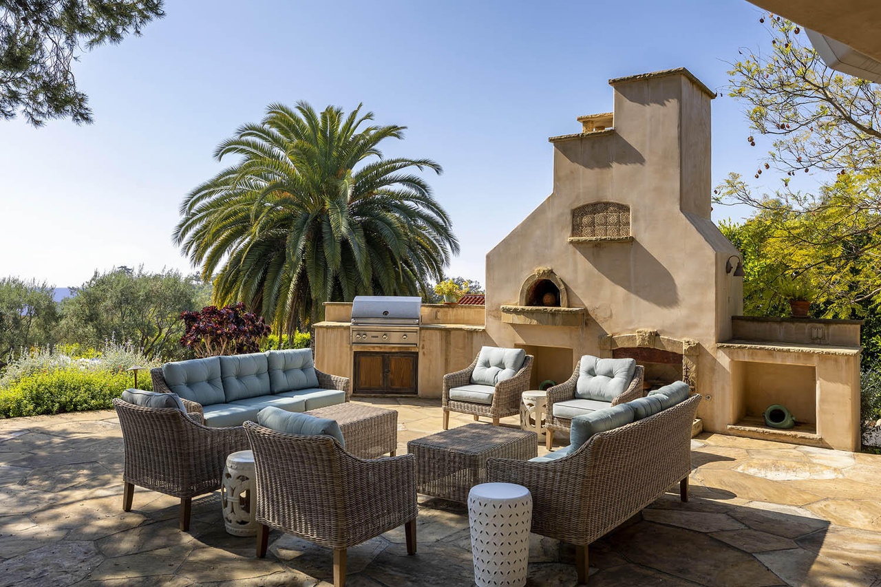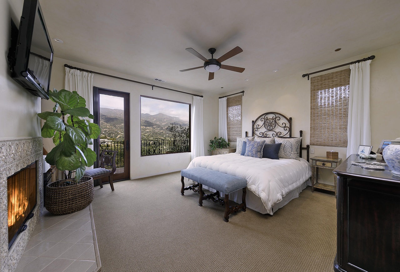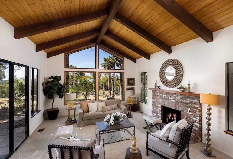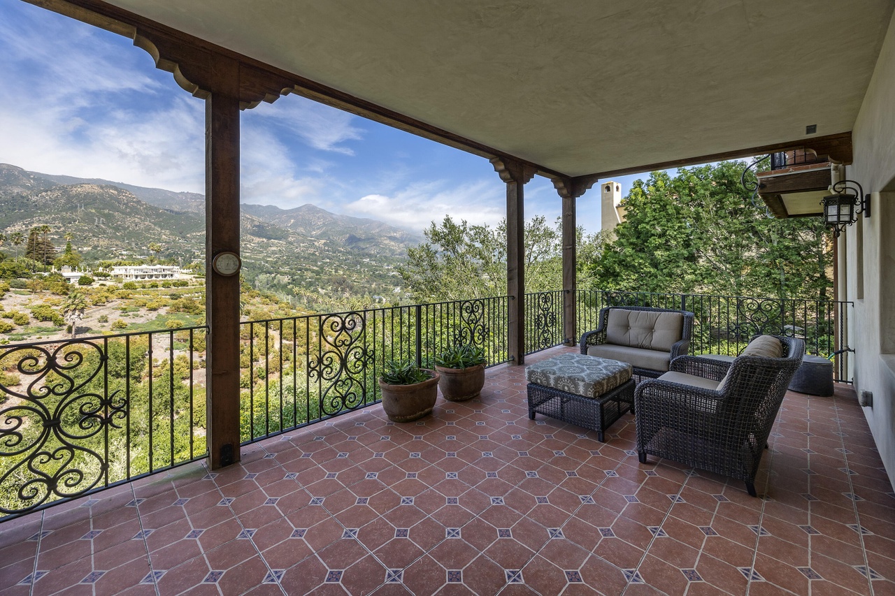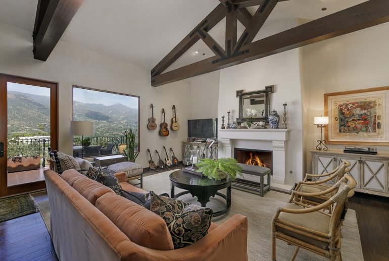 Built in 2010, 686 El Rancho Road ($7.75 million) has just three bedrooms but a bunch of other rooms: game room, office, bonus room, garage workshop…. In the pro column are ocean peeks and mountain views, soaring ceilings (if you’re into that) in the two main common rooms, and a lovely outdoor terrace; less appealing are the primary bedroom’s location right off the living room, the carpeting here and there, and the triangular lot with the front half taken up by motor court.